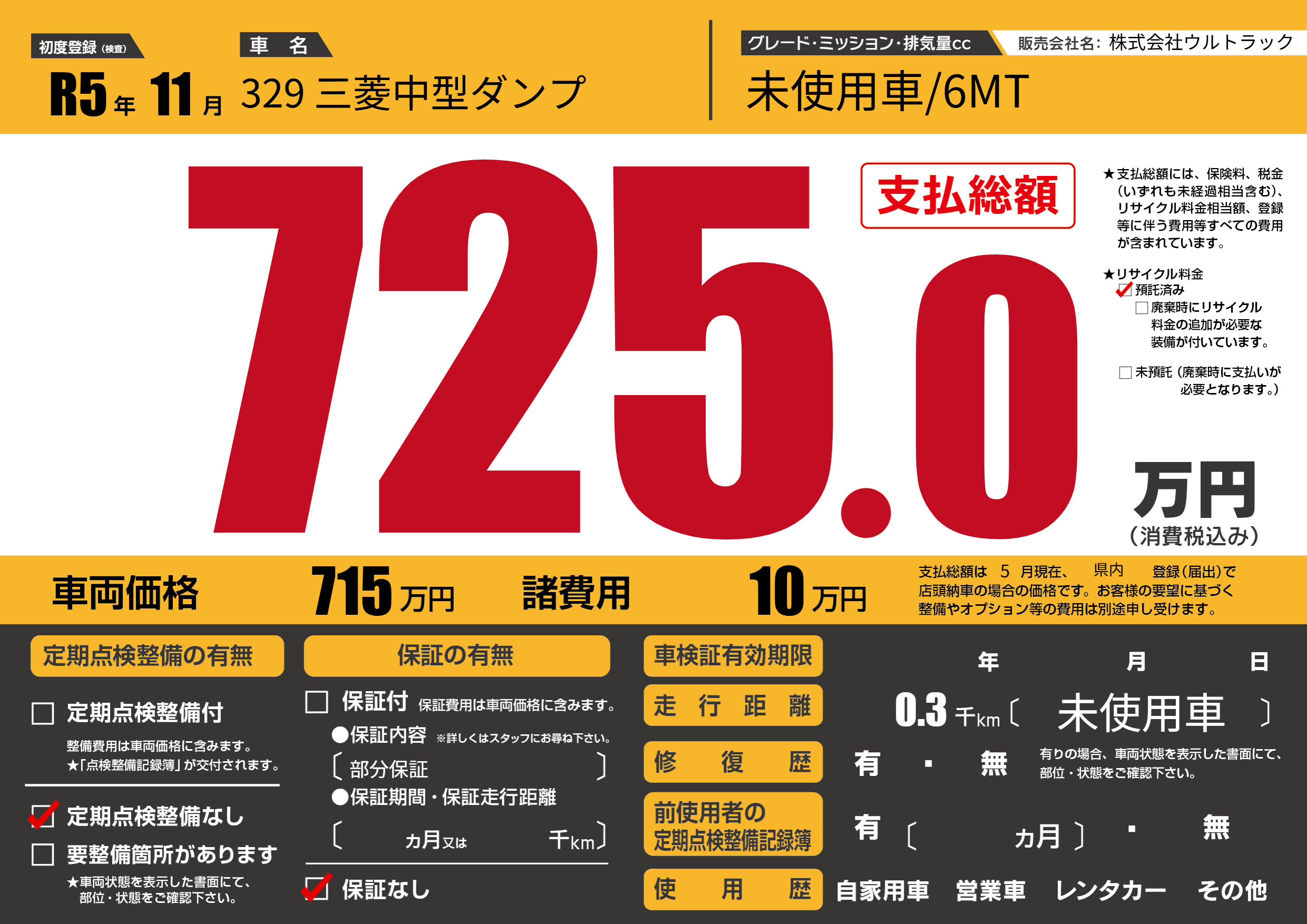 | 車名 | 329 三菱中型ダンプ | グレード ミッション 排気量 |