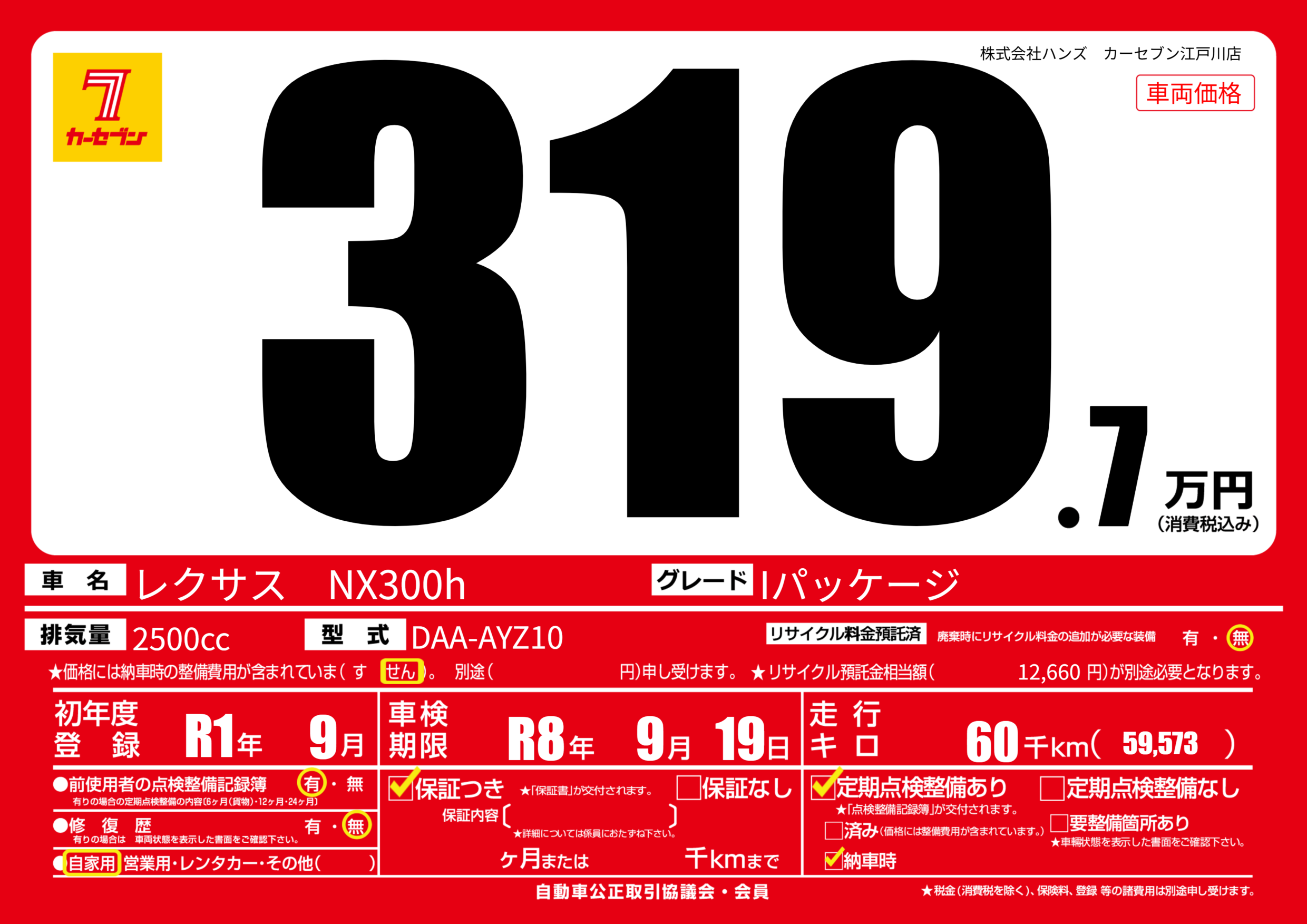 | 車名 | レクサス NX300h | グレード ミッション 排気量 |
