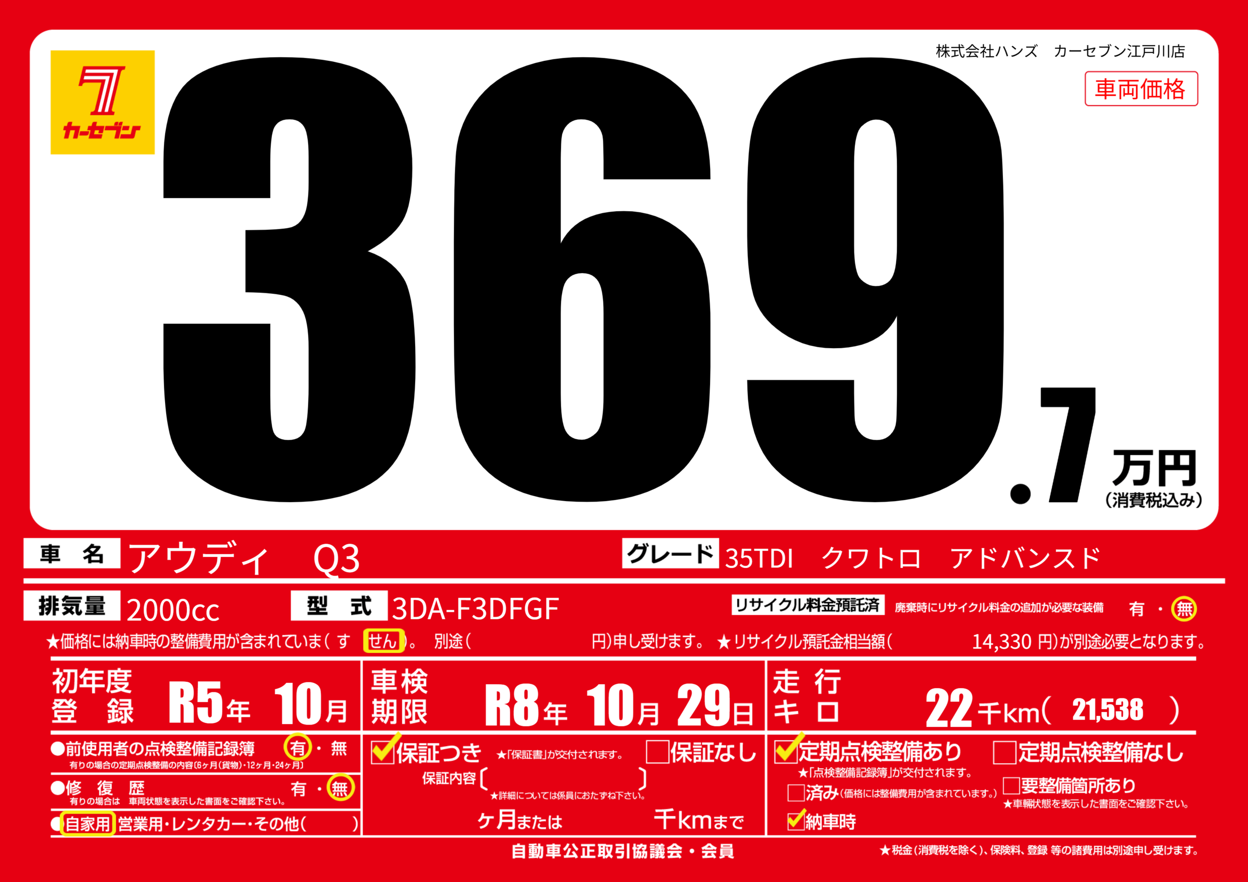 | 走行キロ | 2.2万km | 初年度登録 | R5年10月 |