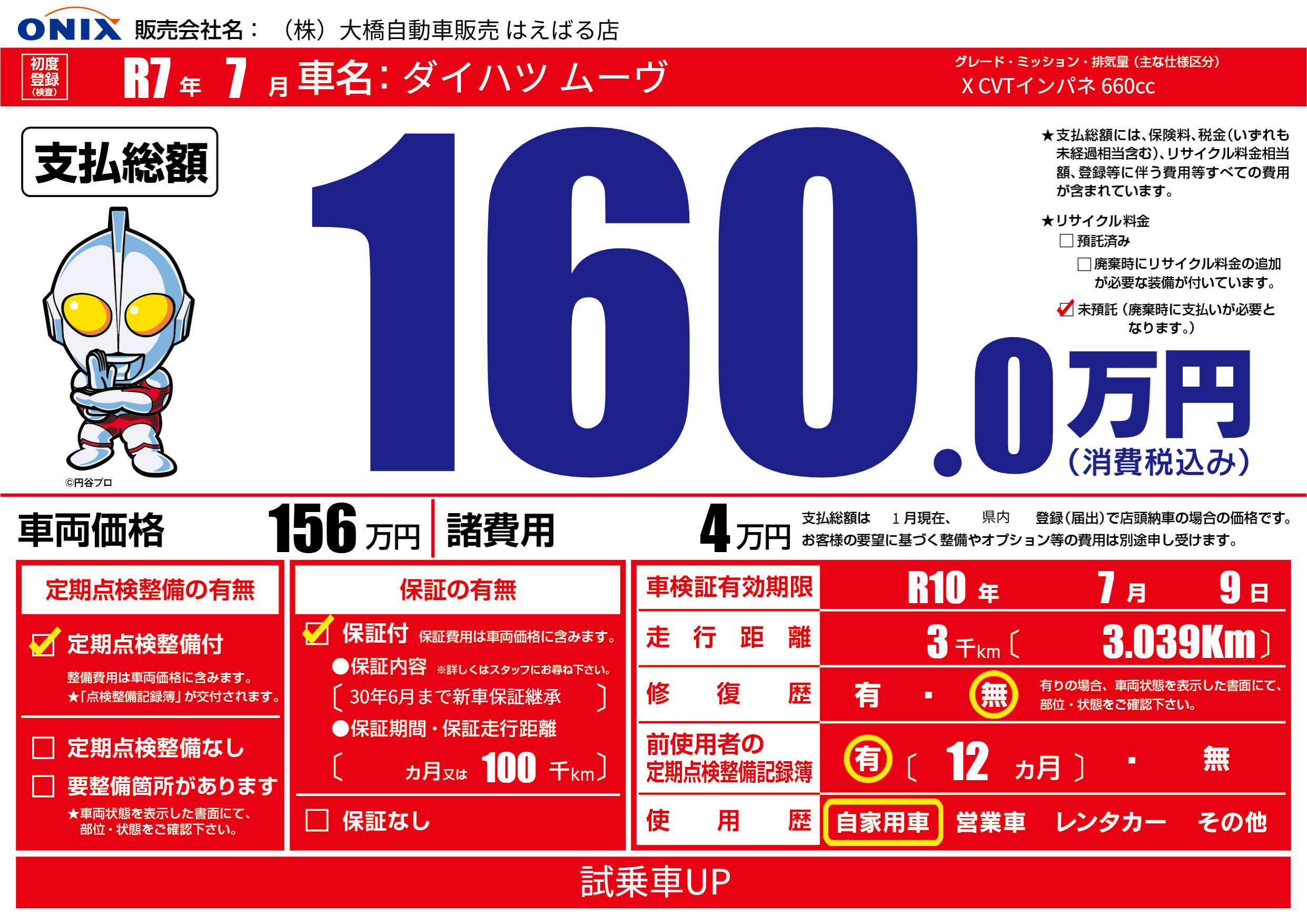 | 走行キロ | 0.3万km | 初年度登録 | R7年7月 |