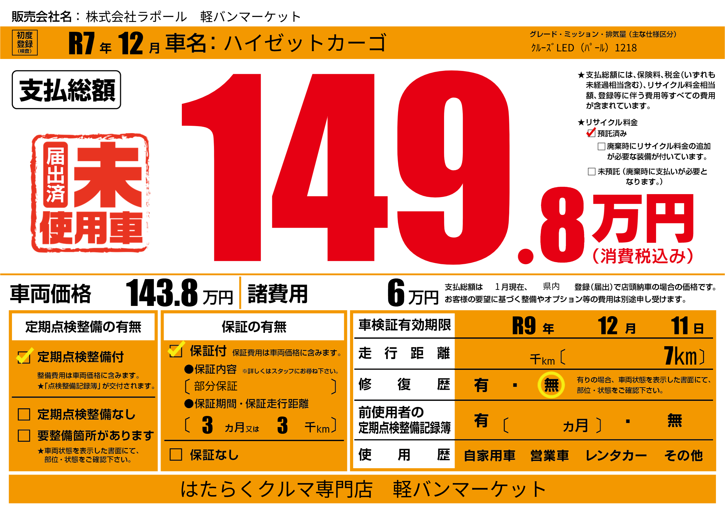 | 走行キロ | - | 初年度登録 | R7年12月 |