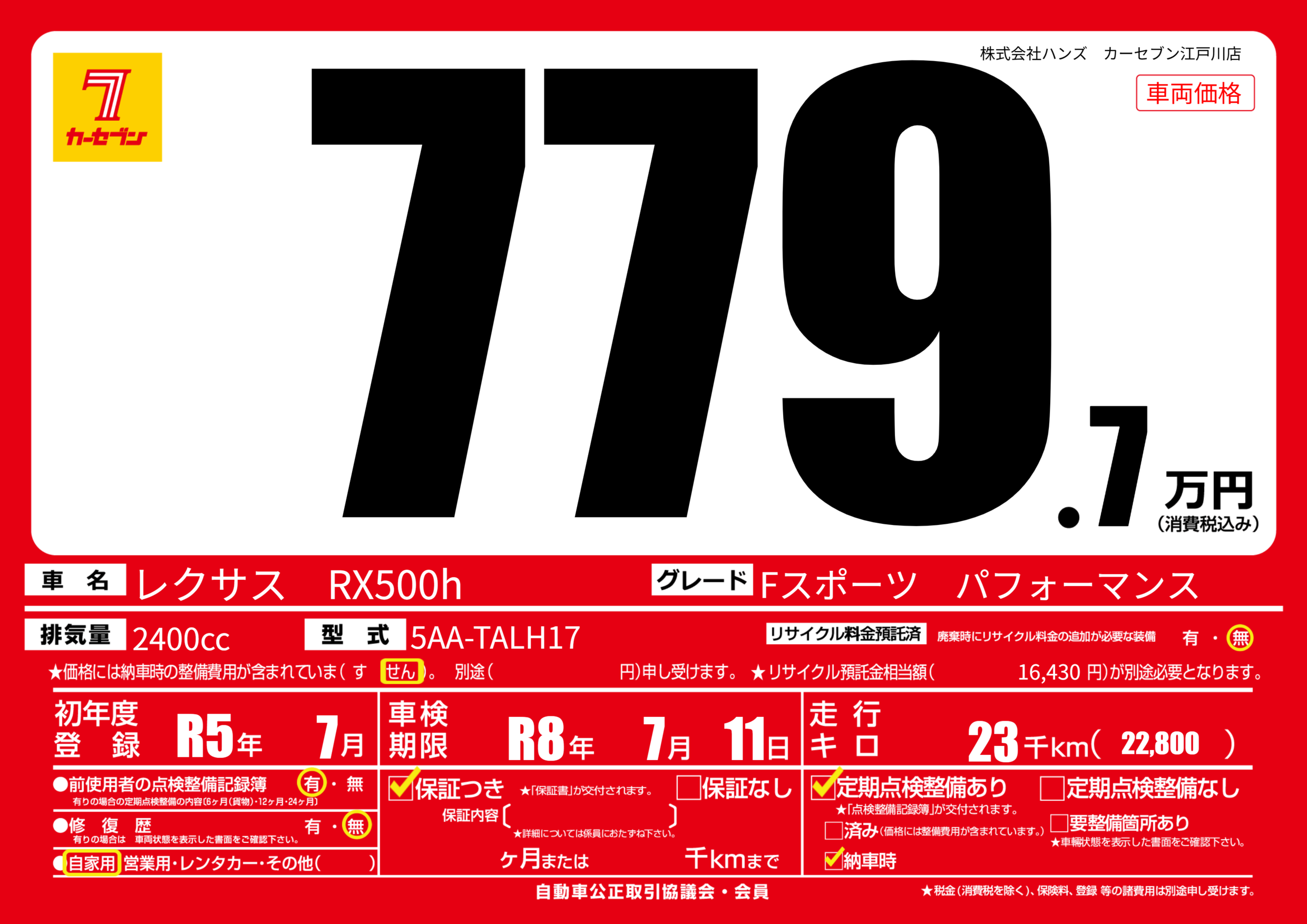 | 走行キロ | 2.3万km | 初年度登録 | R5年7月 |