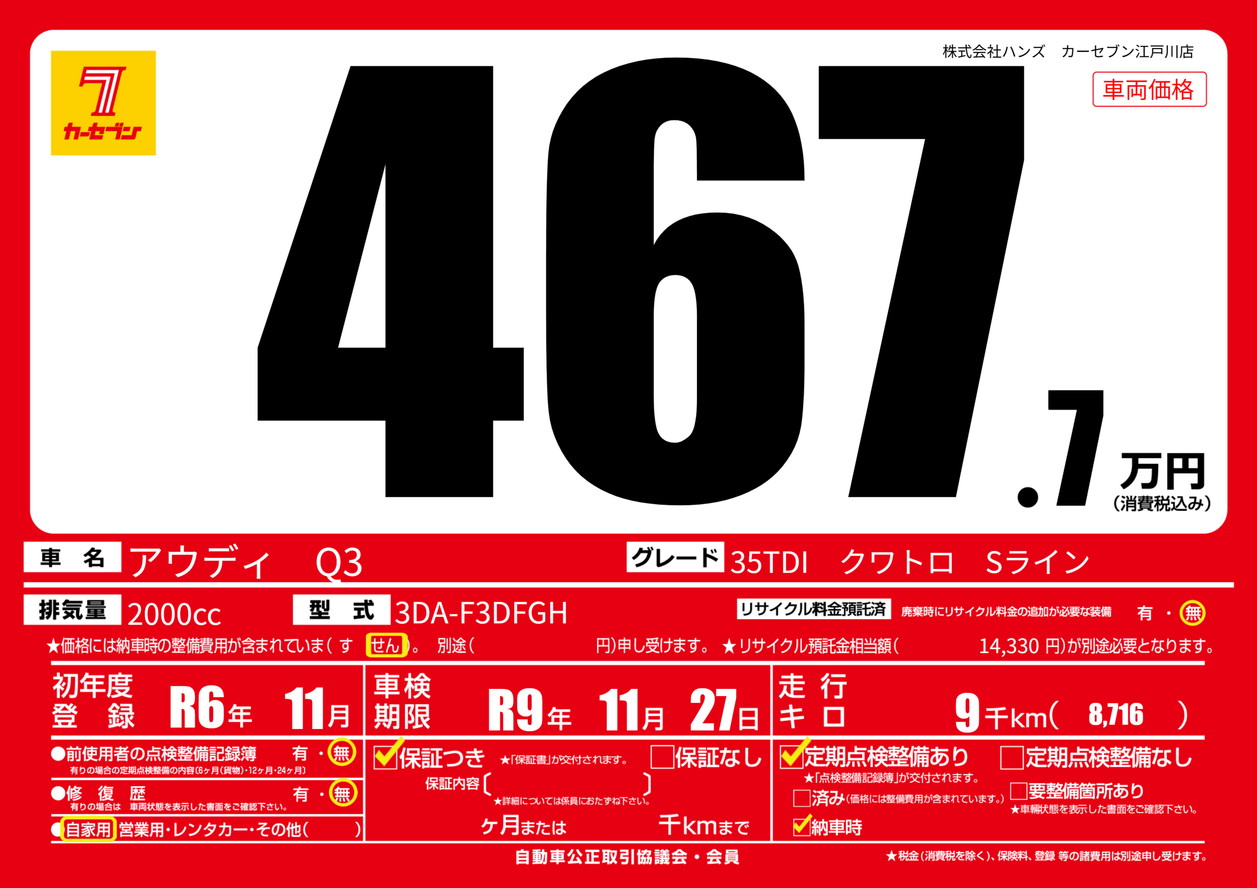 | 車名 | アウディ Q3 | グレード ミッション 排気量 |