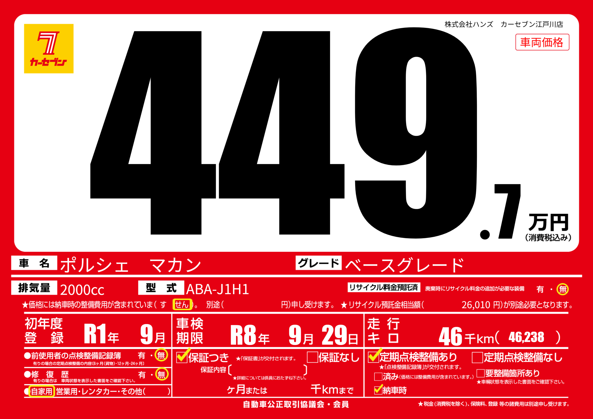 | 車検制限 | R8年 9月 29日 | ||