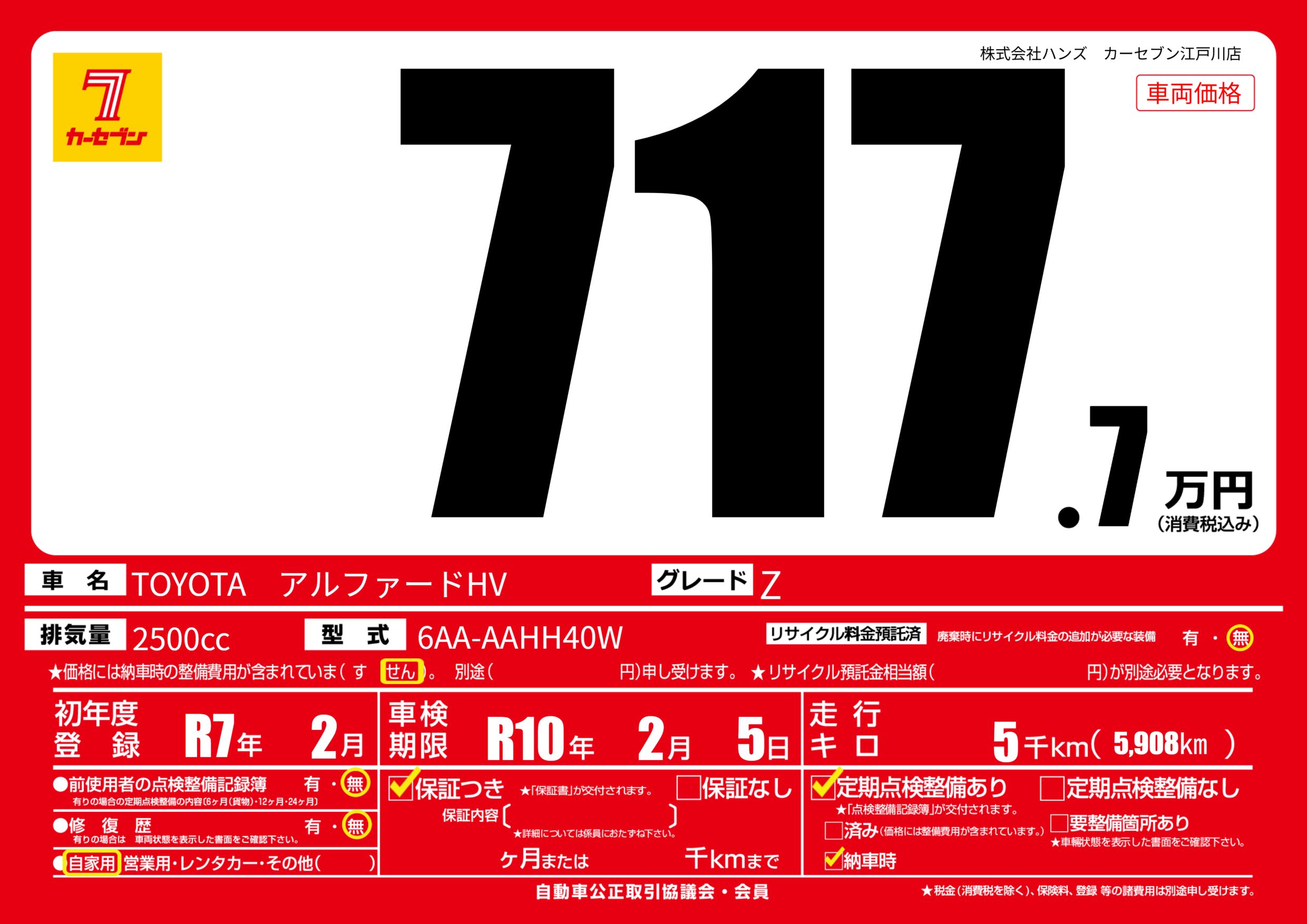 | 車名 | TOYOTA アルファードHV | グレード ミッション 排気量 |