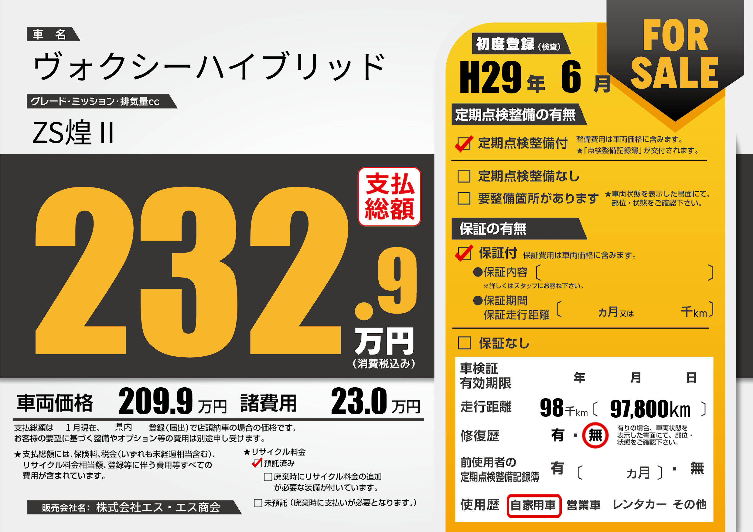 | 走行キロ | 9.8万km | 初年度登録 | H29年6月 |