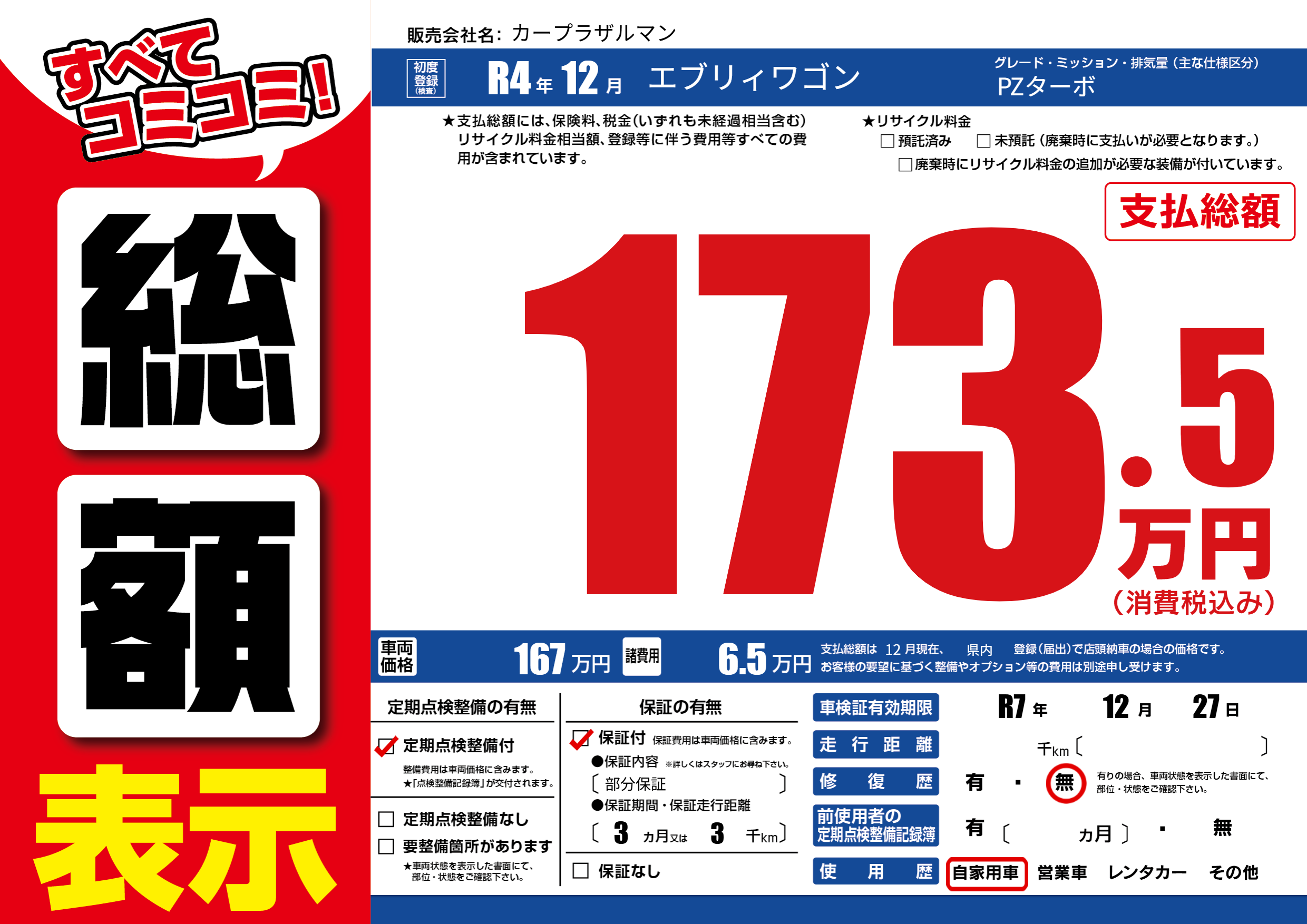 | 車名 | エブリィワゴン | グレード ミッション 排気量 |
