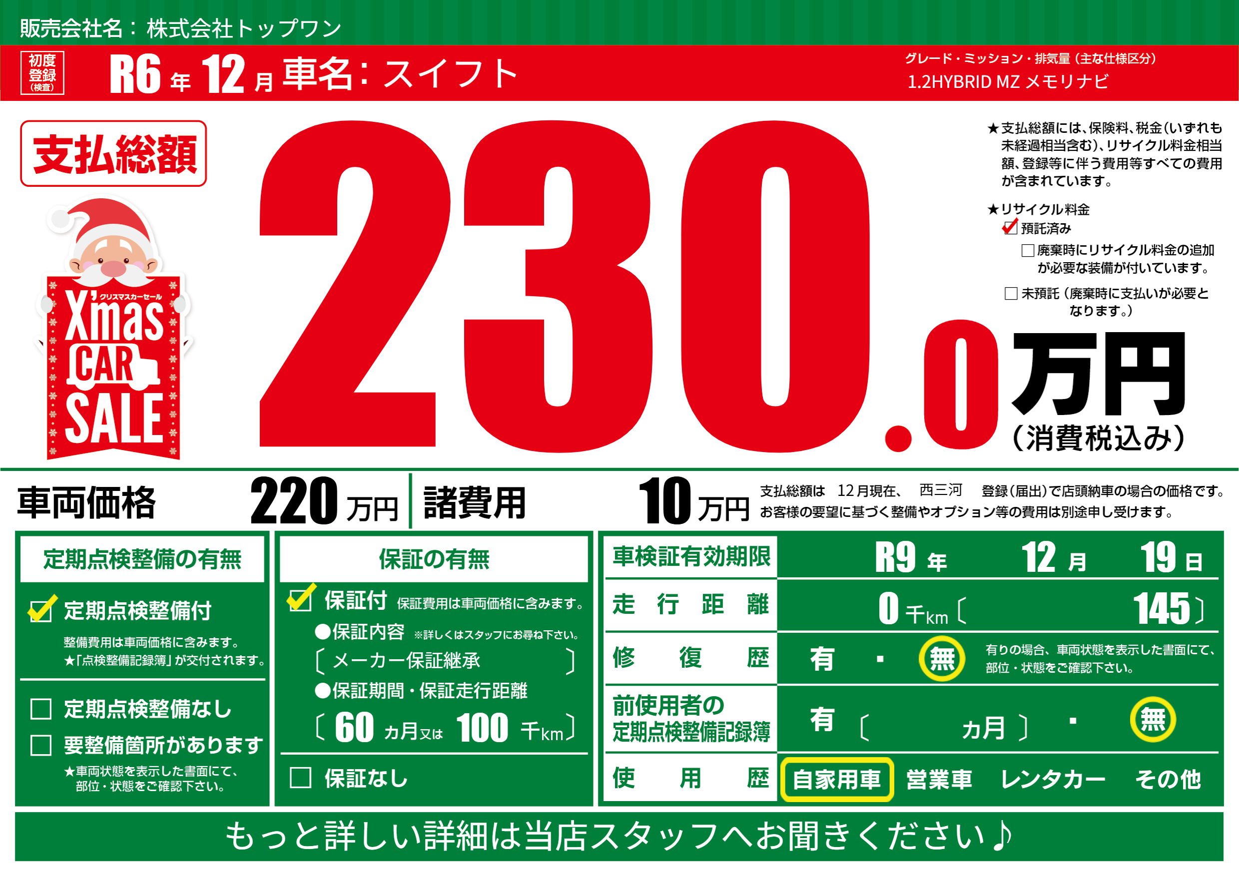 | 走行キロ | - | 初年度登録 | R6年12月 |