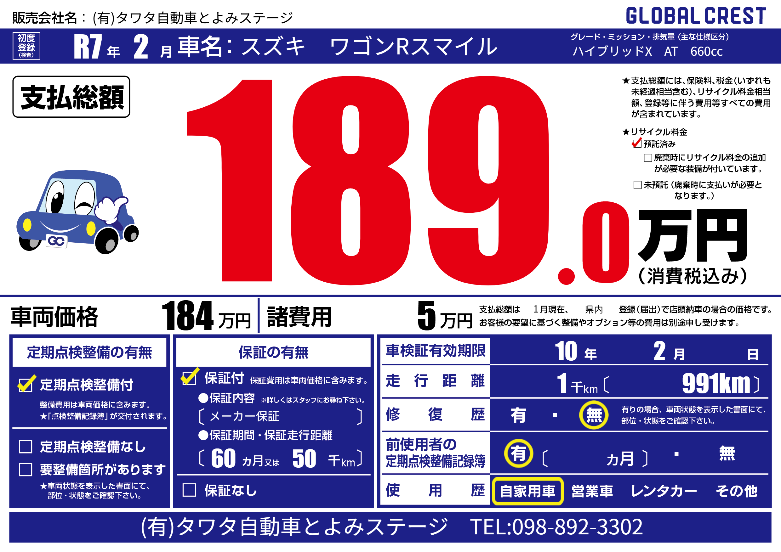 | 車名 | スズキ ワゴンRスマイル | グレード ミッション 排気量 |