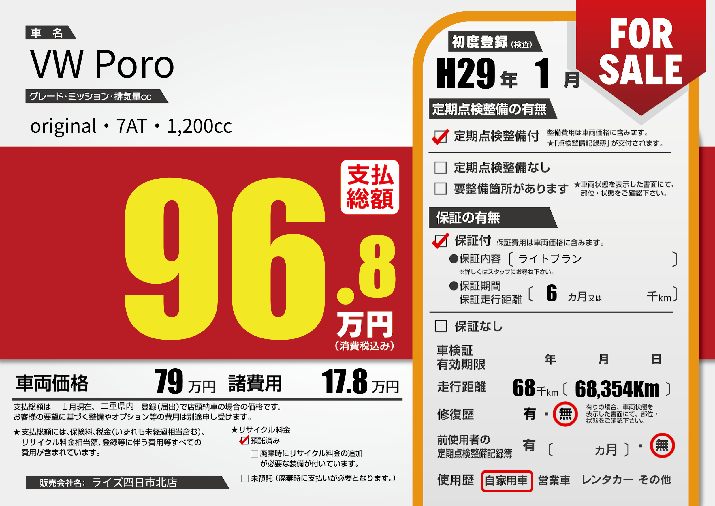 | 車名 | VW Poro | グレード ミッション 排気量 |