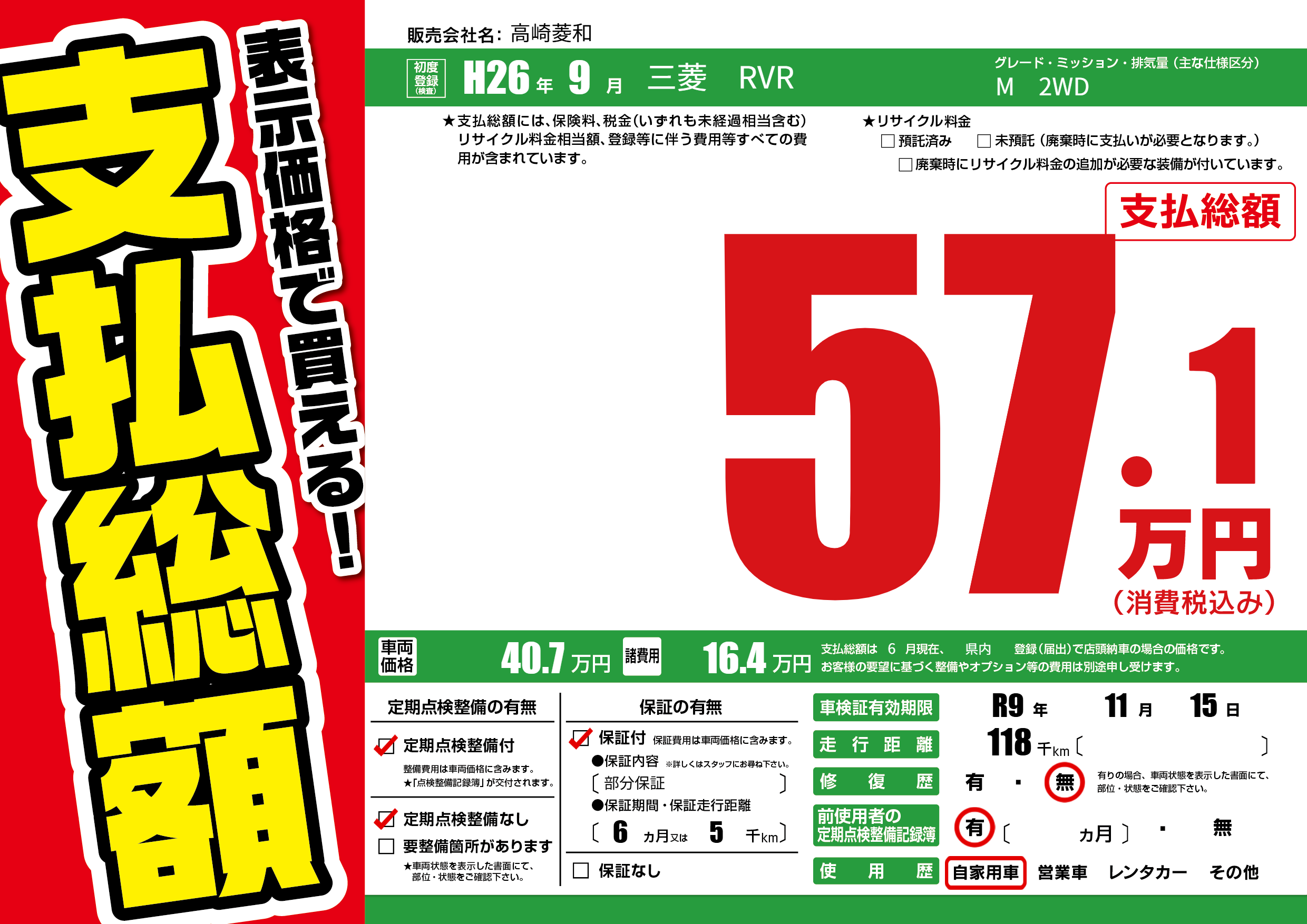 なし | 車検制限 | R9年11月15月 |