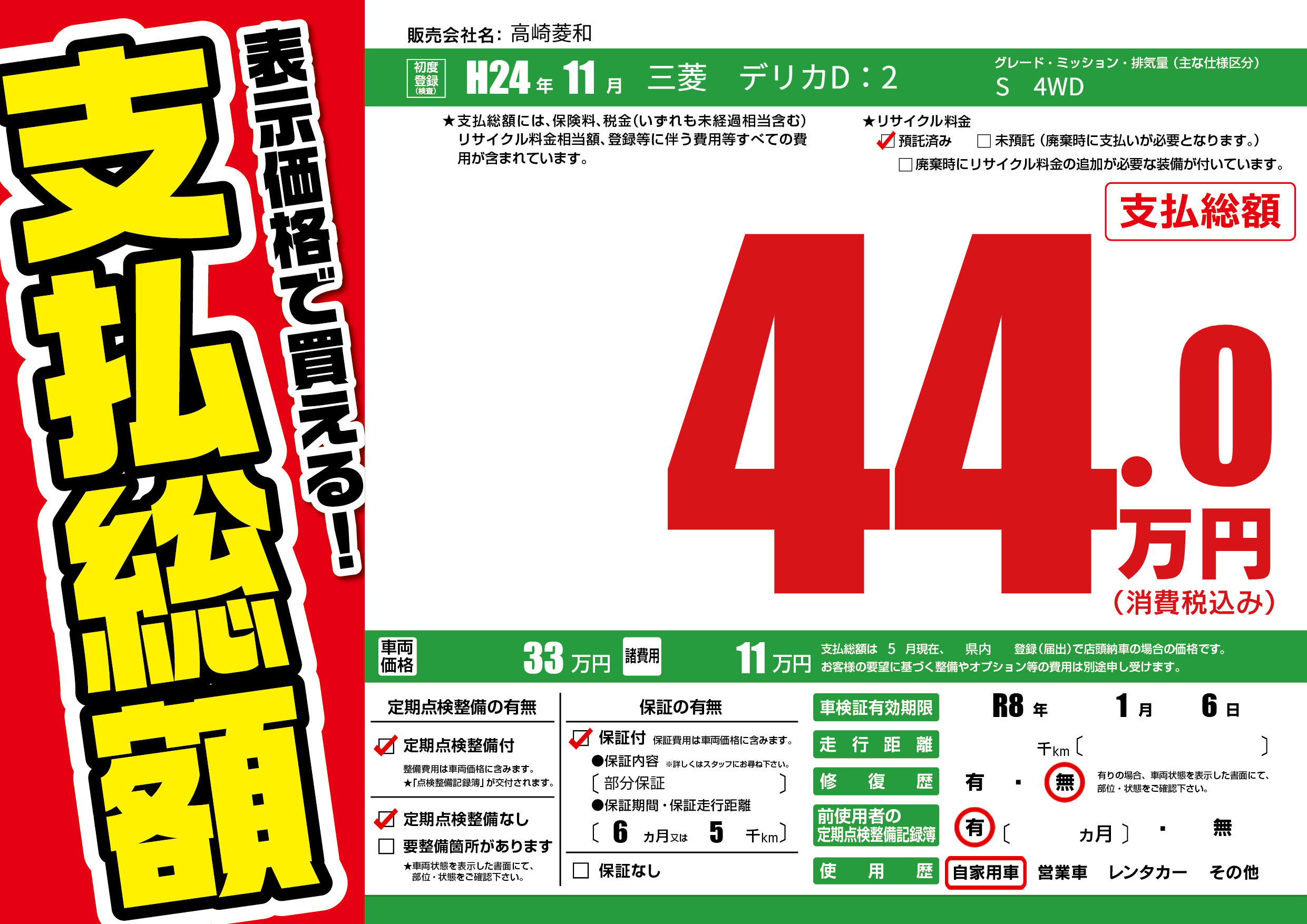 保証付き 保証内容(部分保証) 6ヶ月または(5)千kmまで |
