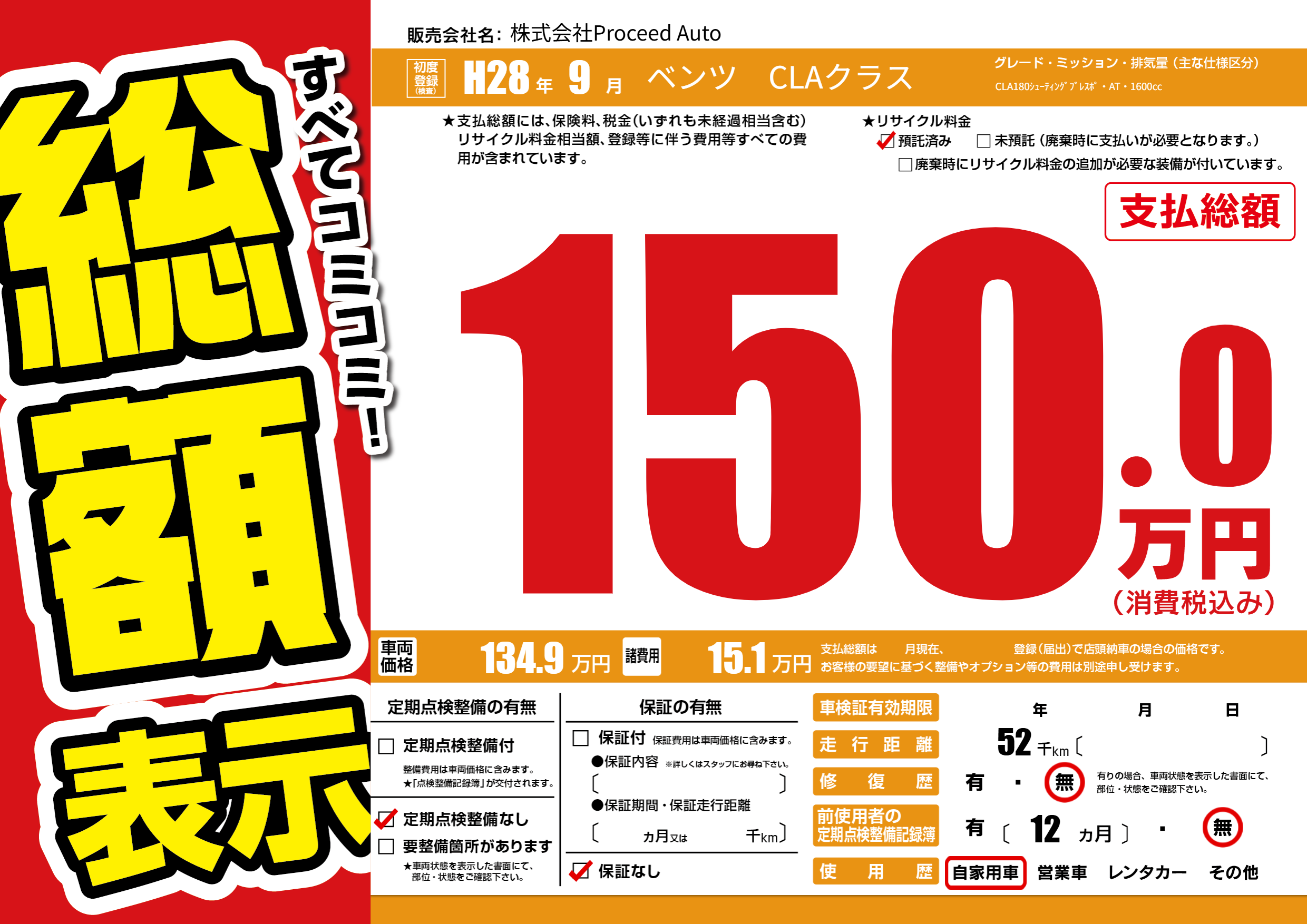 | 車名 | ベンツ CLAクラス | グレード ミッション 排気量 |