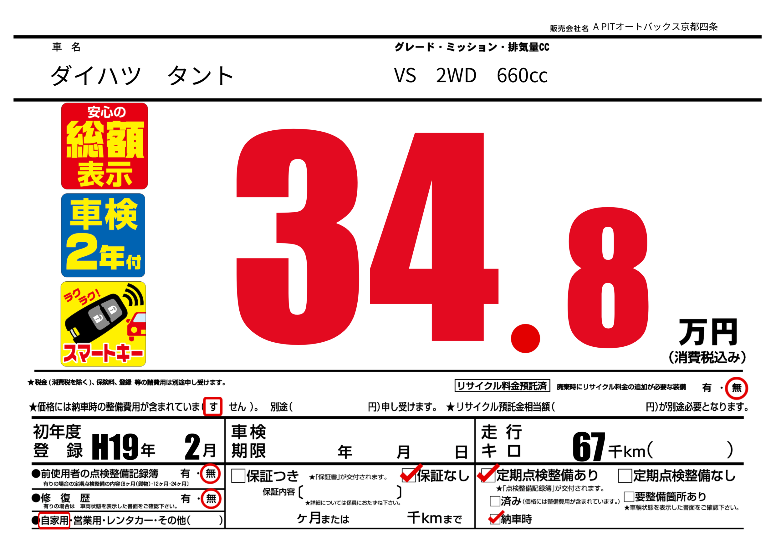 | 車名 | ダイハツ タント | グレード ミッション 排気量 |