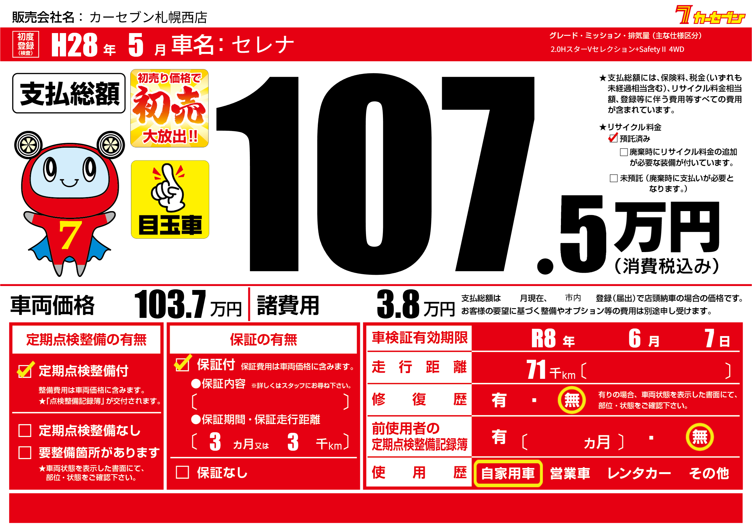 | 走行キロ | 7.1万km | 初年度登録 | H28年5月 |