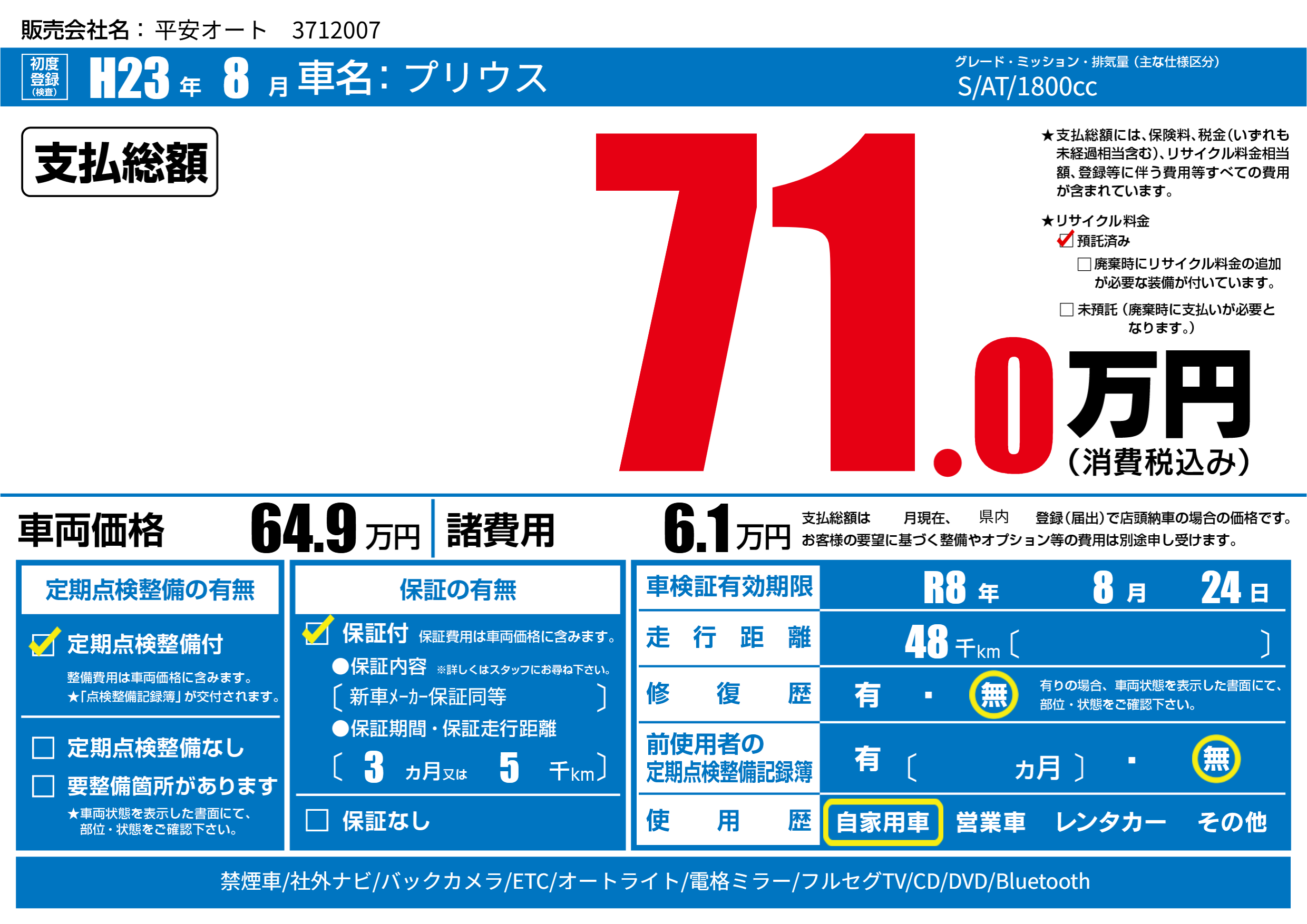 | 走行キロ | 4.8万km | 初年度登録 | H23年8月 |