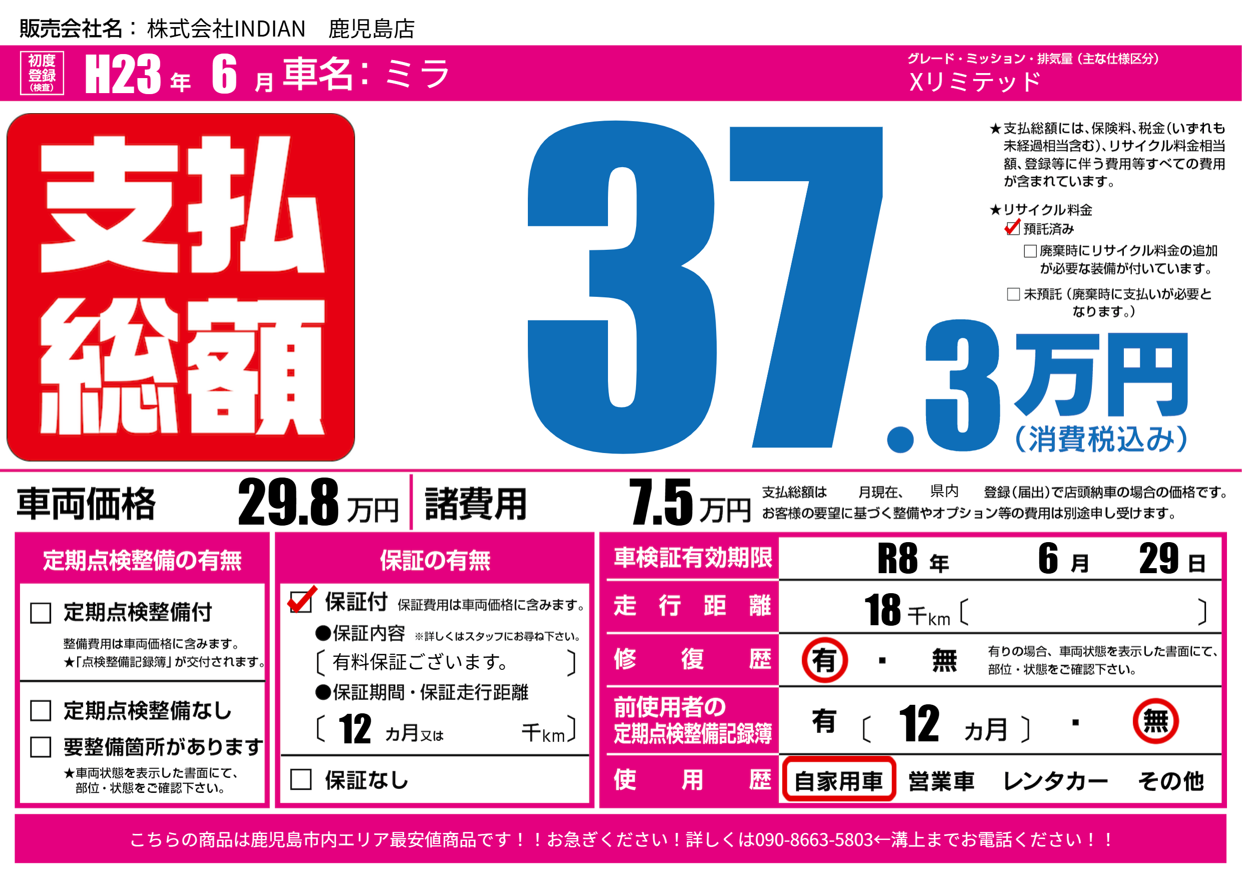 | 走行キロ | 1.8万km | 初年度登録 | H23年6月 |