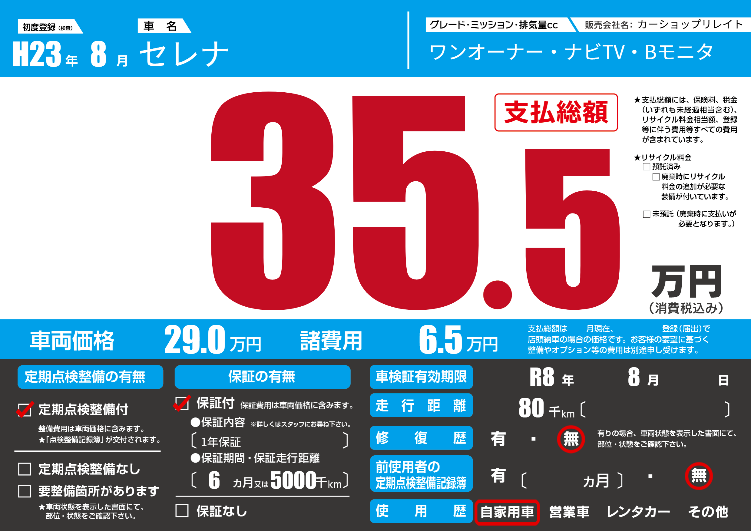 | 車検制限 | R8年 8月 - 日 | ||