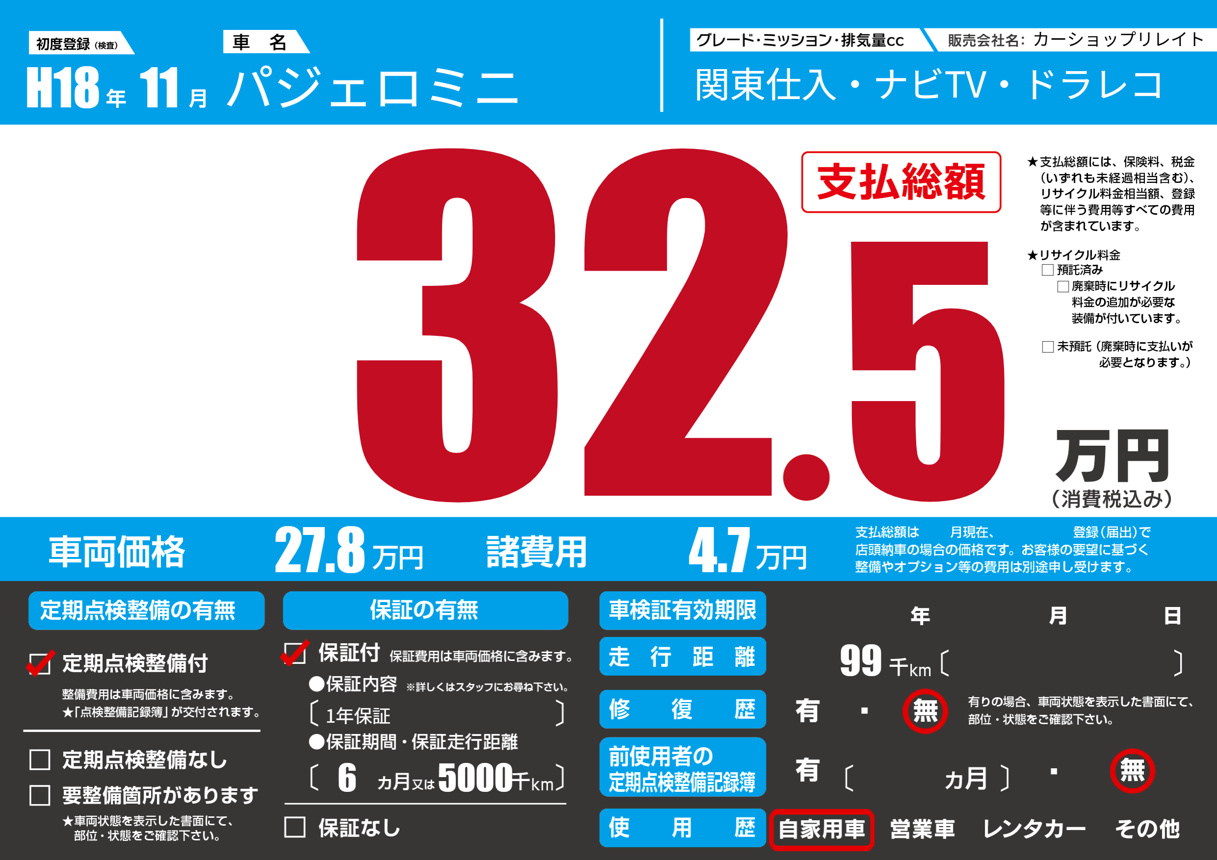 | 車名 | パジェロミニ | グレード ミッション 排気量 |