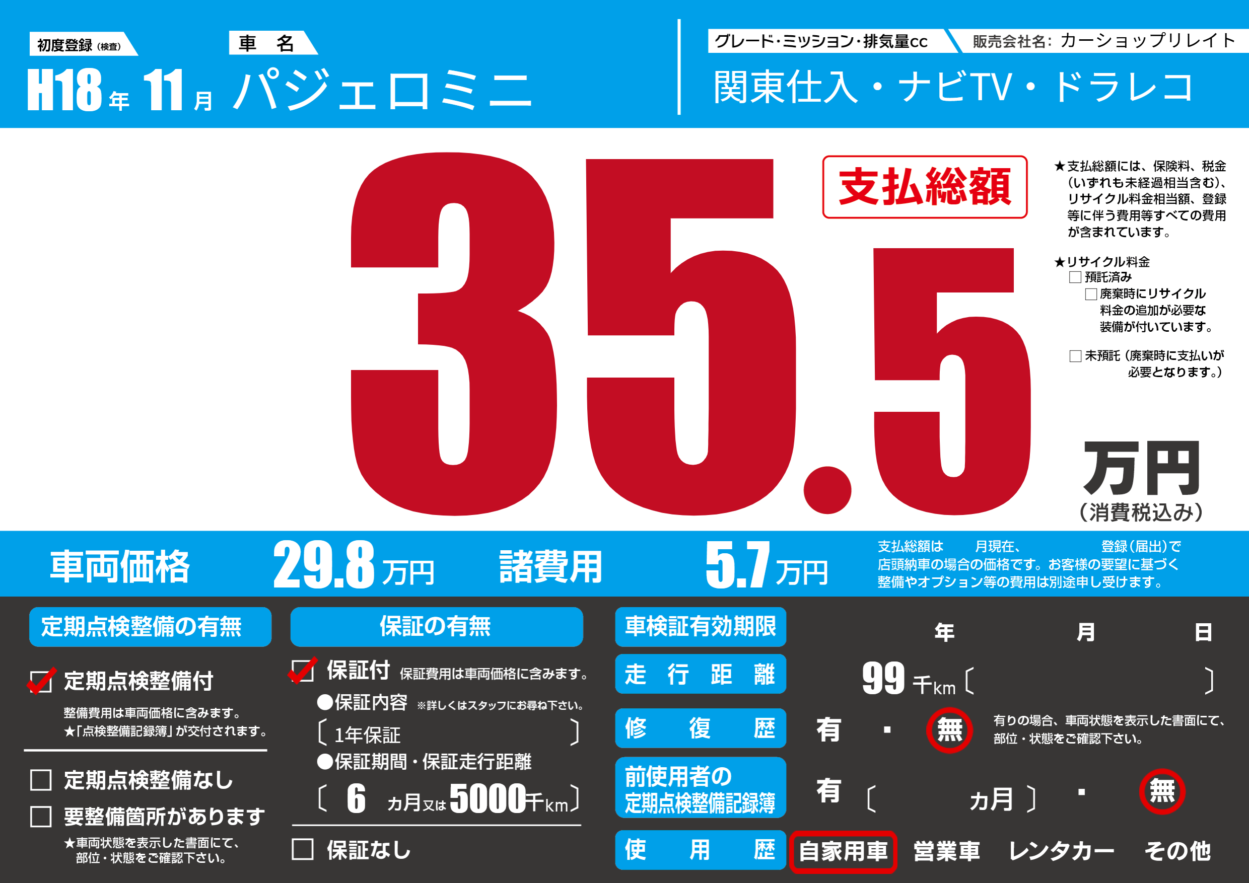| 走行キロ | 9.9万km | 初年度登録 | H18年11月 |