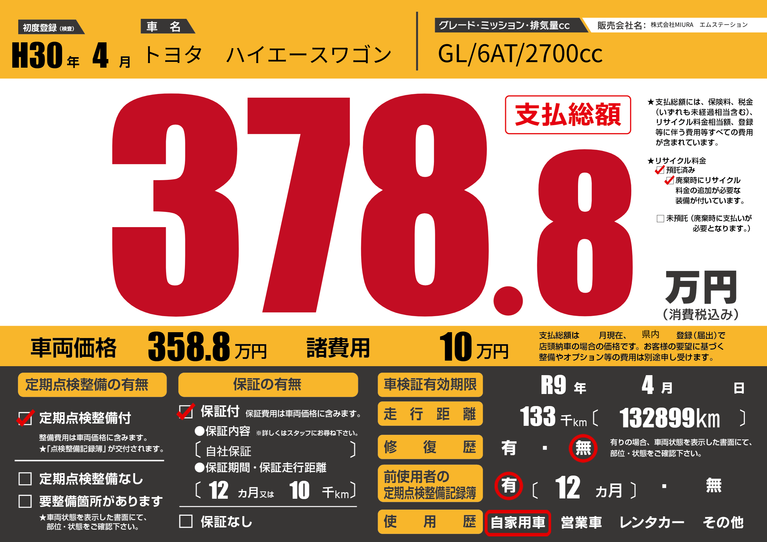 | 車検制限 | R9年 4月 - 日 | ||