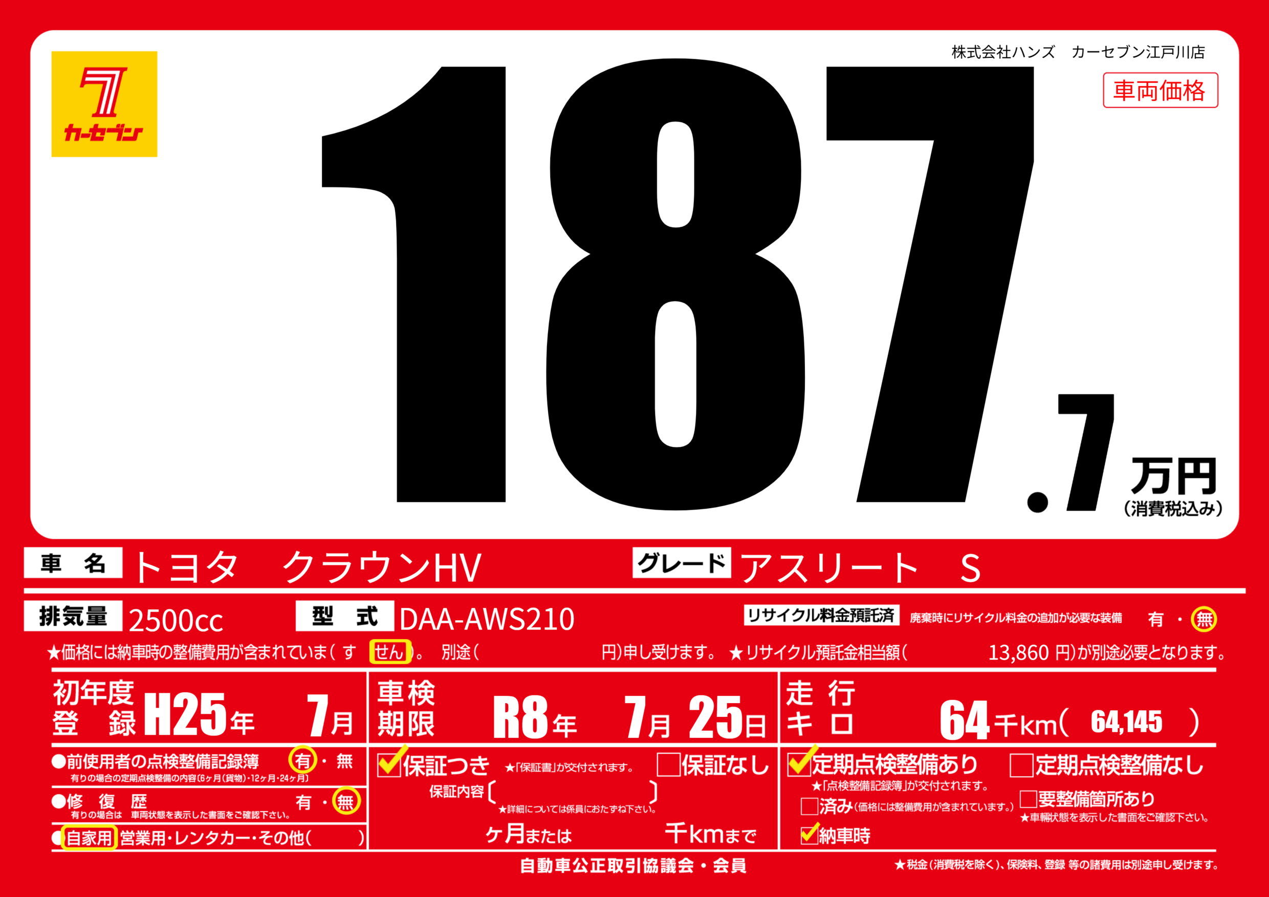 | 車名 | トヨタ クラウンHV | グレード ミッション 排気量 |