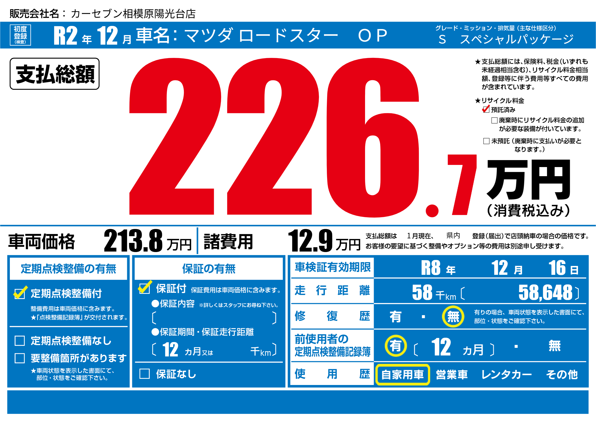 | 車名 | マツダ ロードスター OP | グレード ミッション 排気量 |