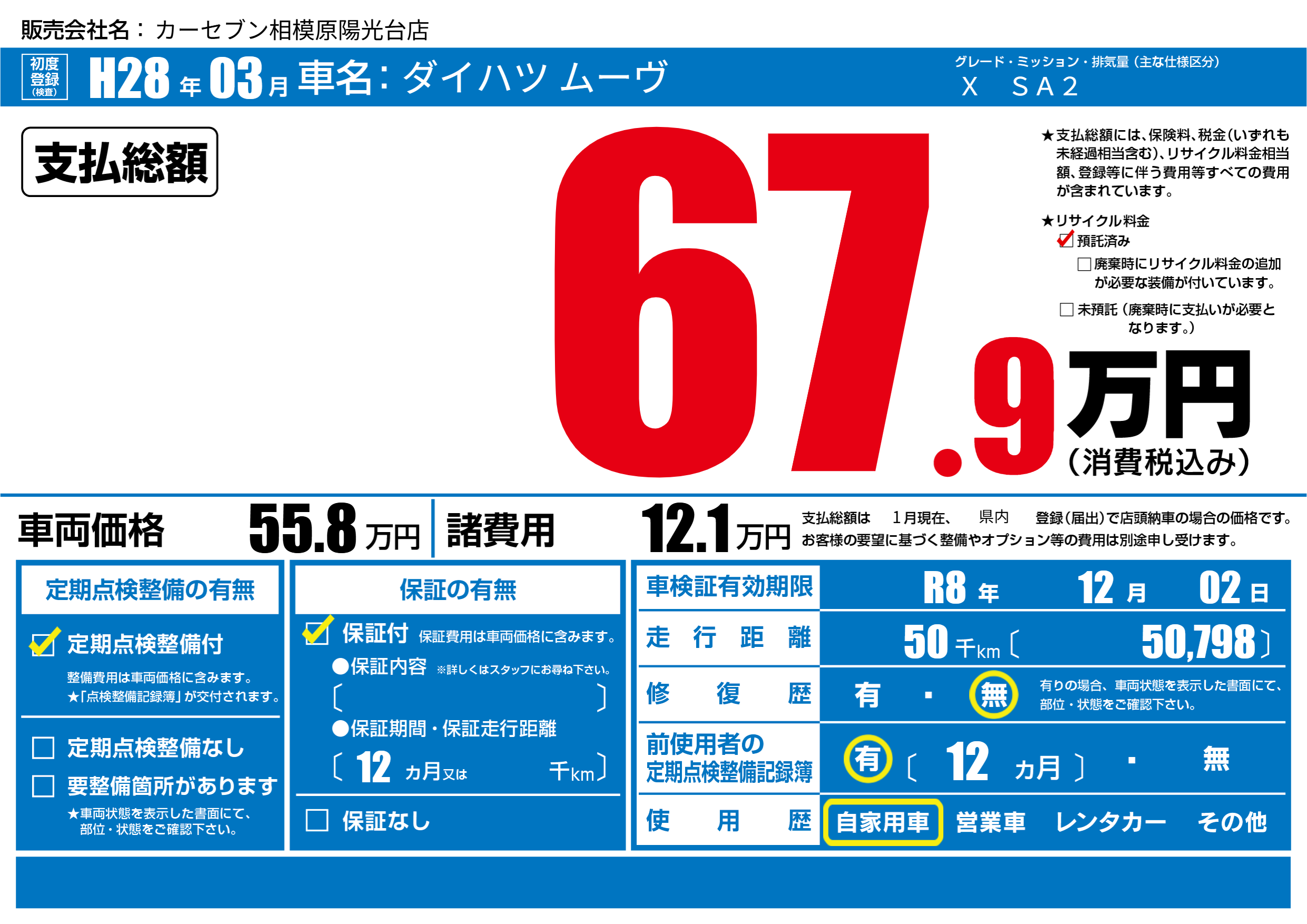 | 車検制限 | R8年 12月 02日 | ||