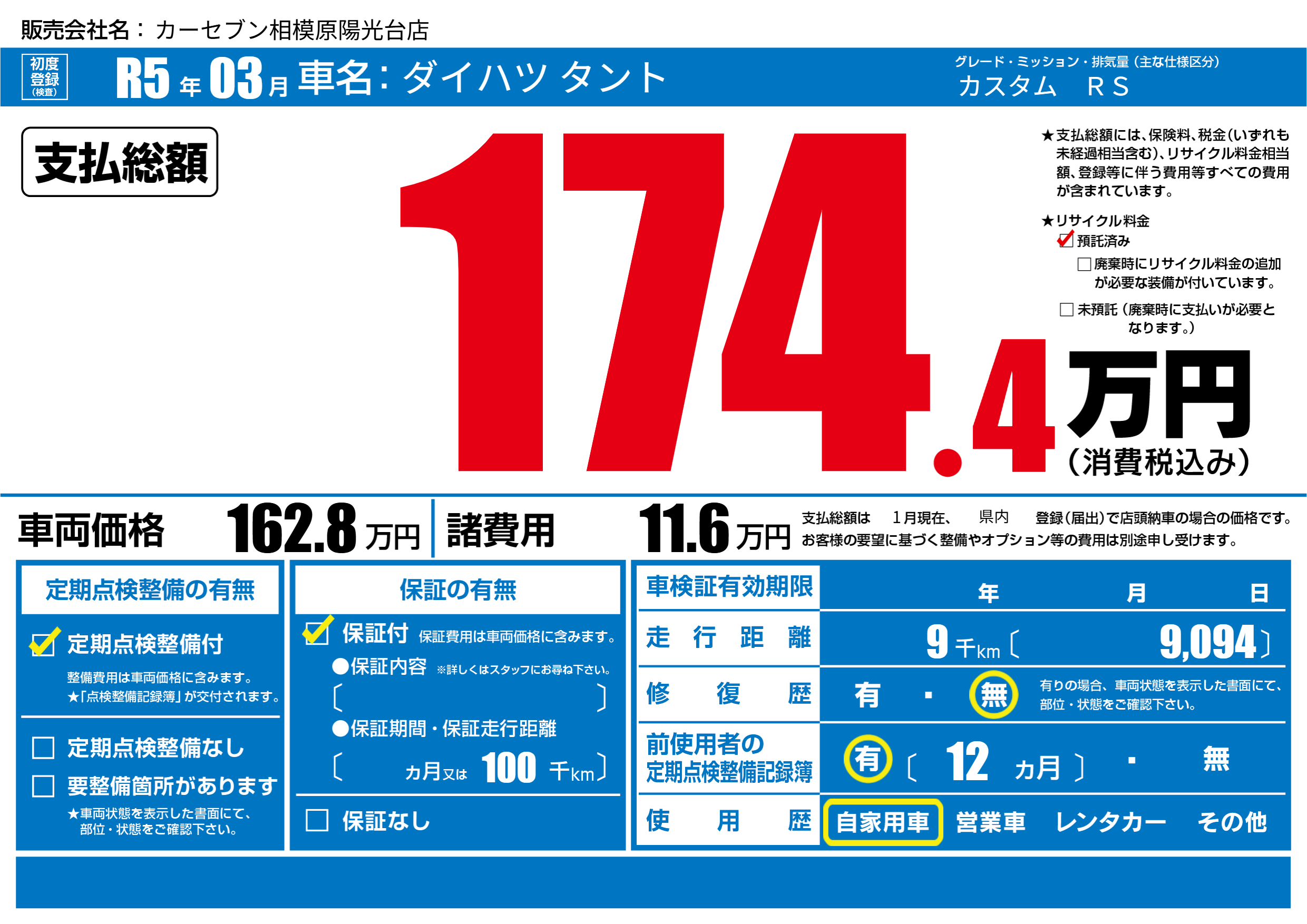 | 走行キロ | 0.9万km | 初年度登録 | R5年03月 |