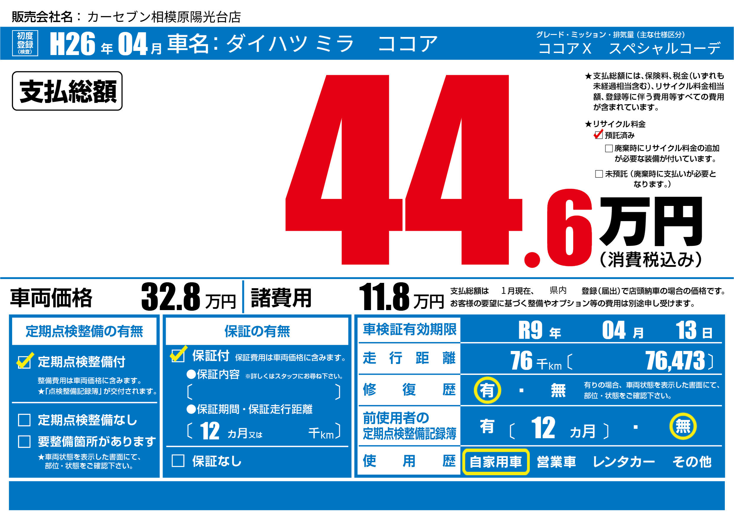 | 走行キロ | 7.6万km | 初年度登録 | H26年04月 |