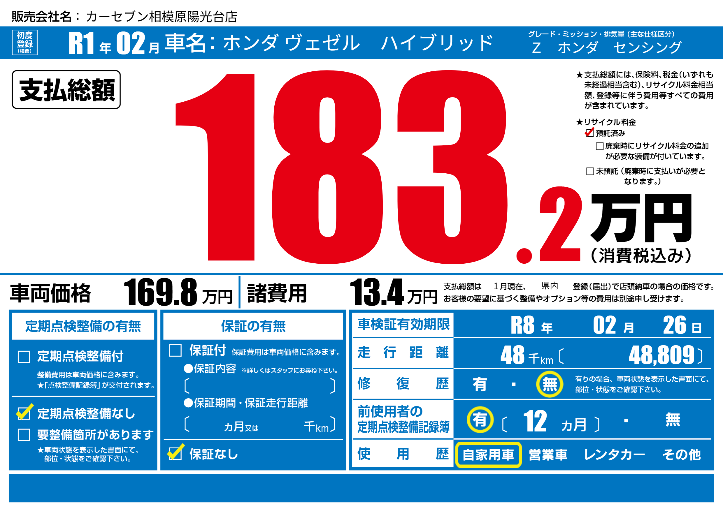 | 車名 | ホンダ ヴェゼル ハイブリッド | グレード ミッション 排気量 |