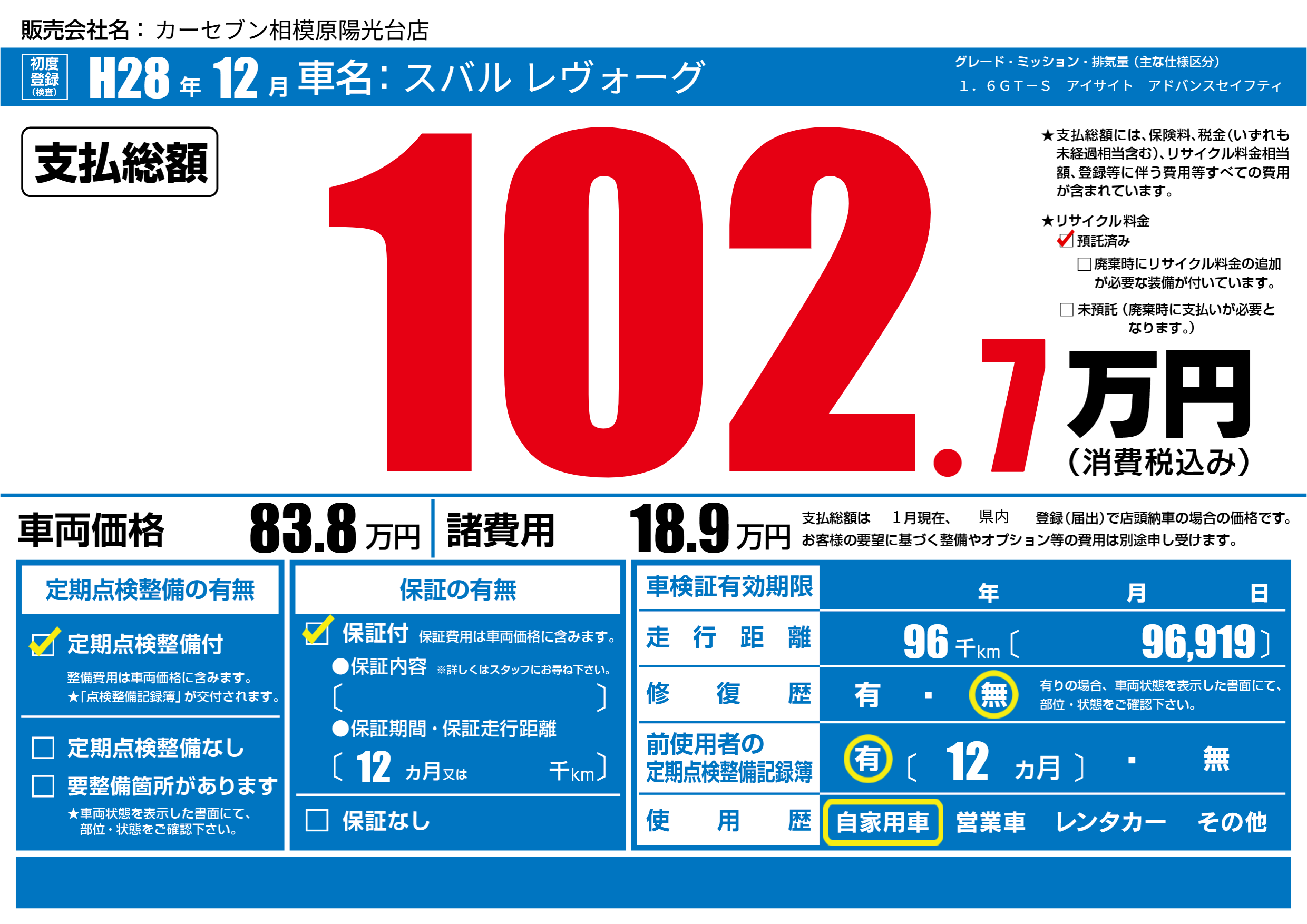 | 車名 | スバル レヴォーグ | グレード ミッション 排気量 |