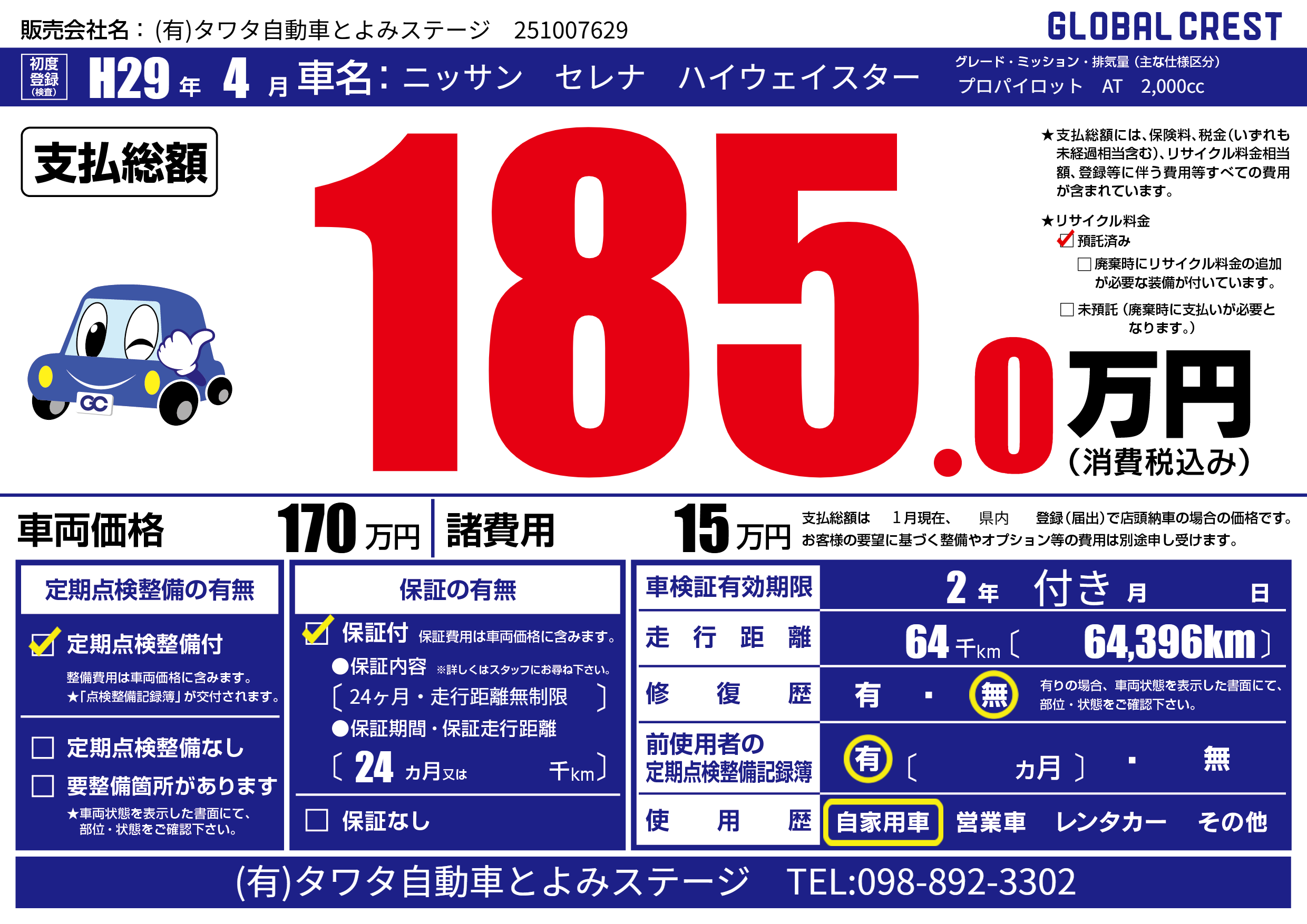 | 車名 | ニッサン セレナ ハイウェイスター | グレード ミッション 排気量 |