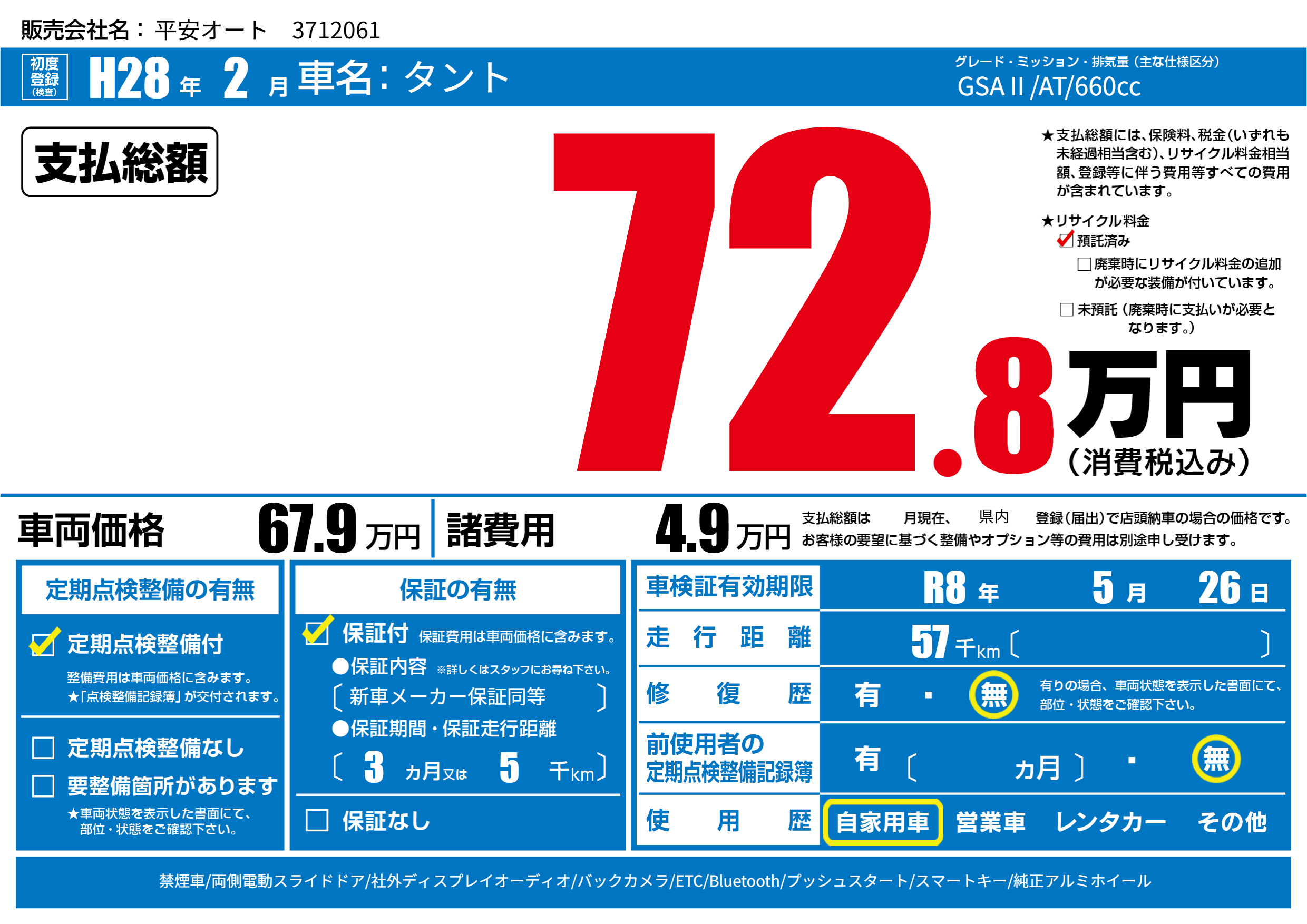| 走行キロ | 5.7万km | 初年度登録 | H28年2月 |