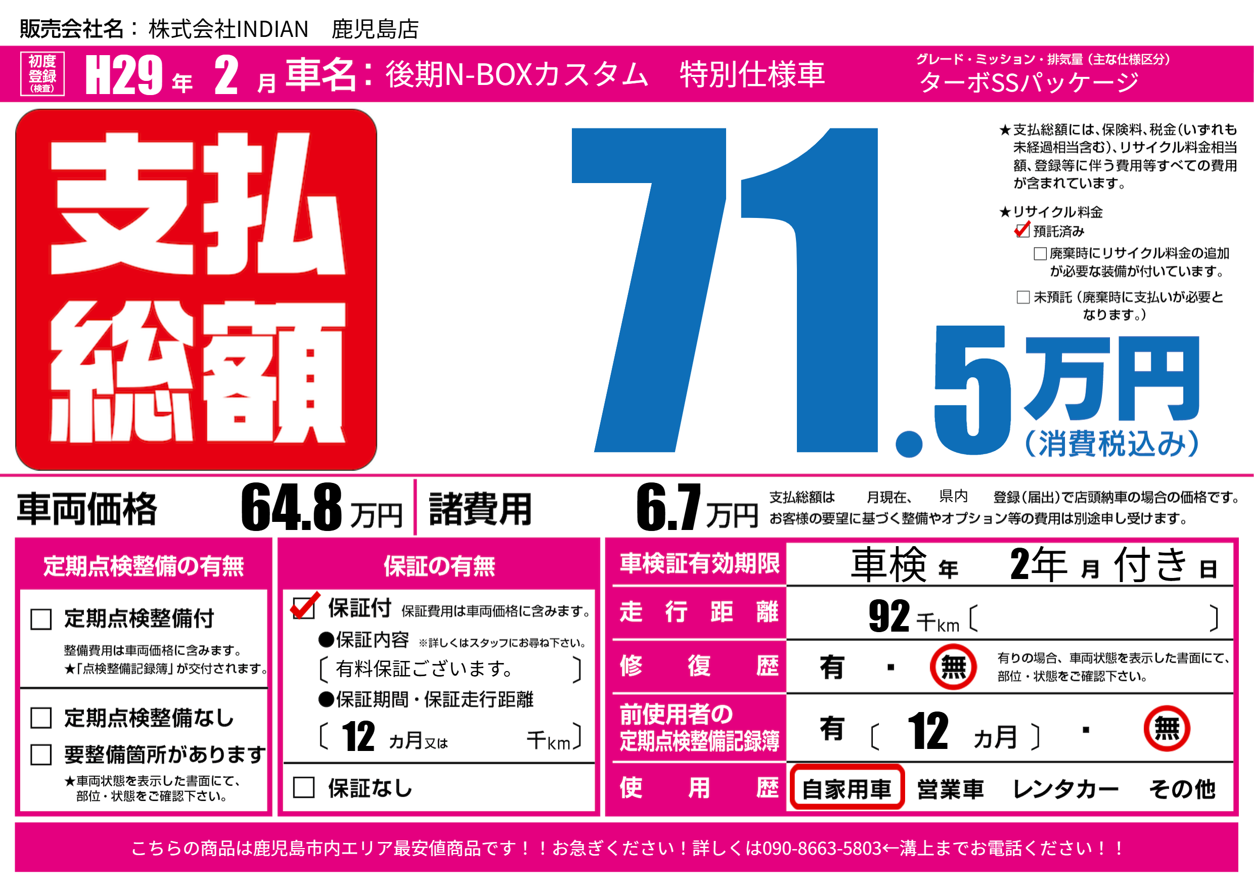 | 車名 | 後期N-BOXカスタム 特別仕様車 | グレード ミッション 排気量 |