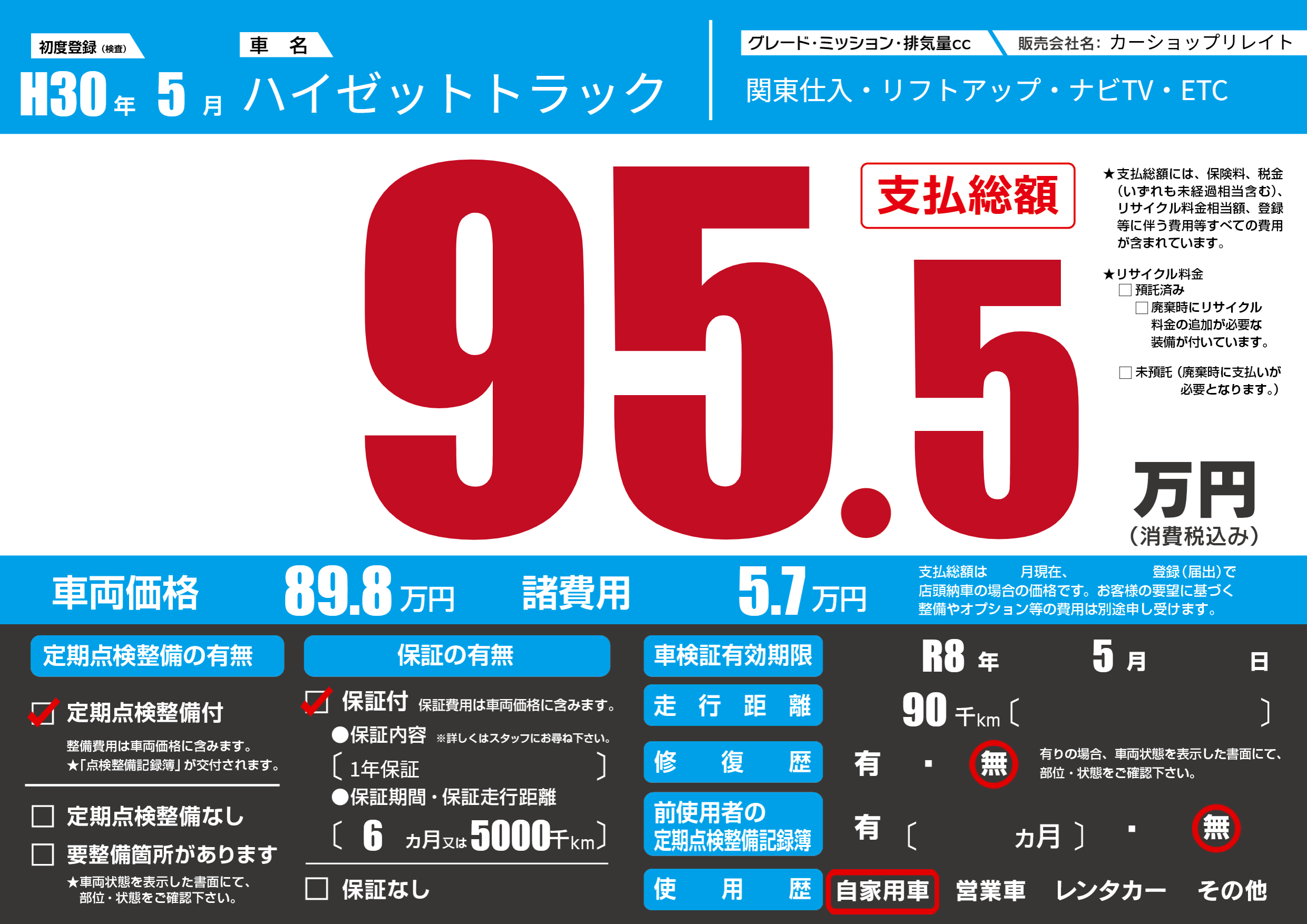 | 走行キロ | 9万km | 初年度登録 | H30年5月 |