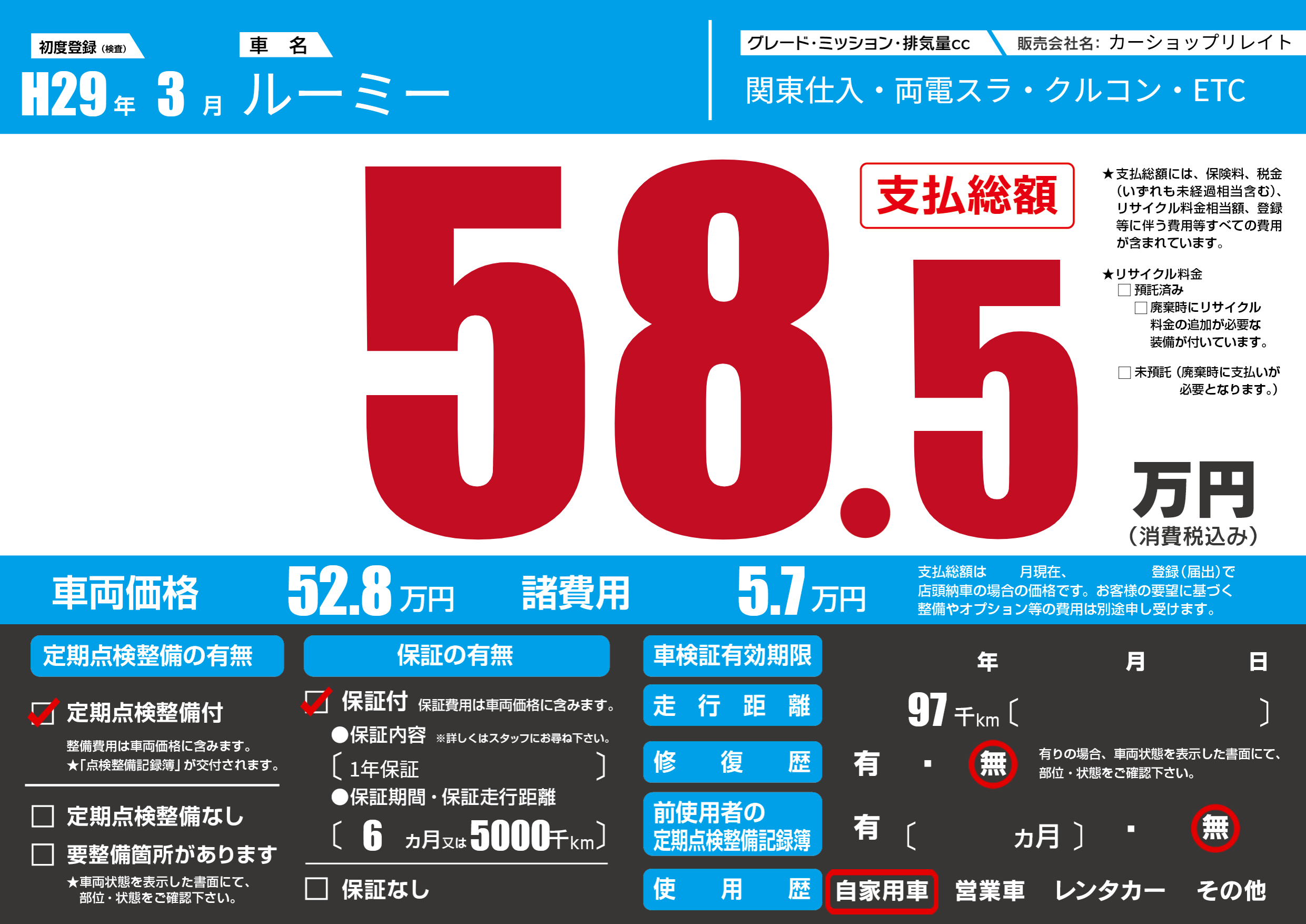 | 車名 | ルーミー | グレード ミッション 排気量 |