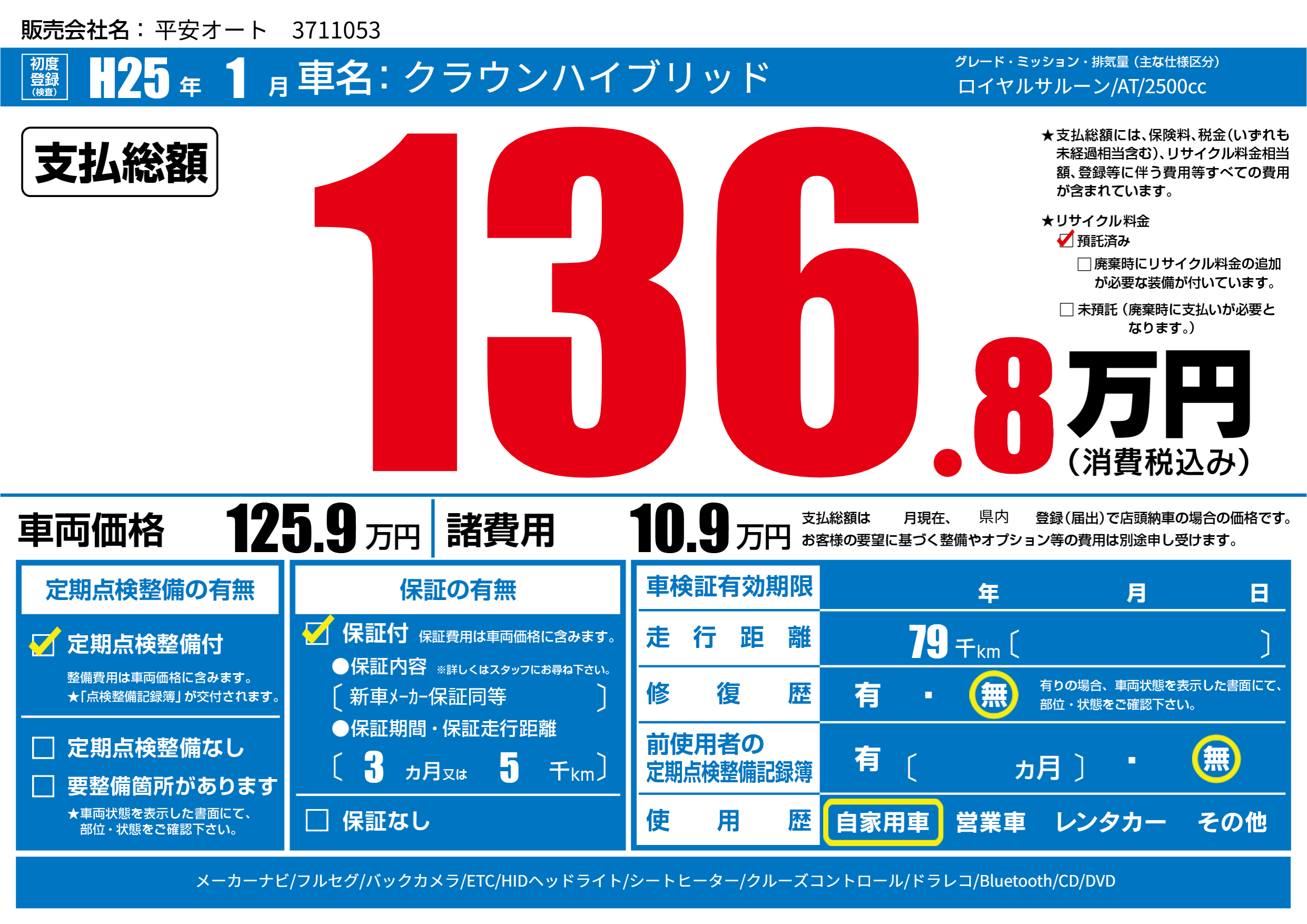 | 車名 | クラウンハイブリッド | グレード ミッション 排気量 |