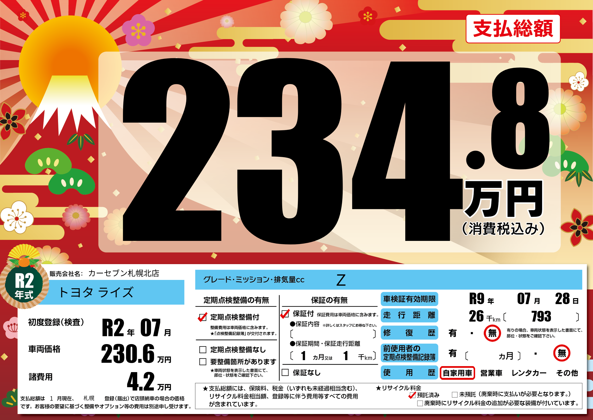 | 走行キロ | 2.6万km | 初年度登録 | R2年07月 |