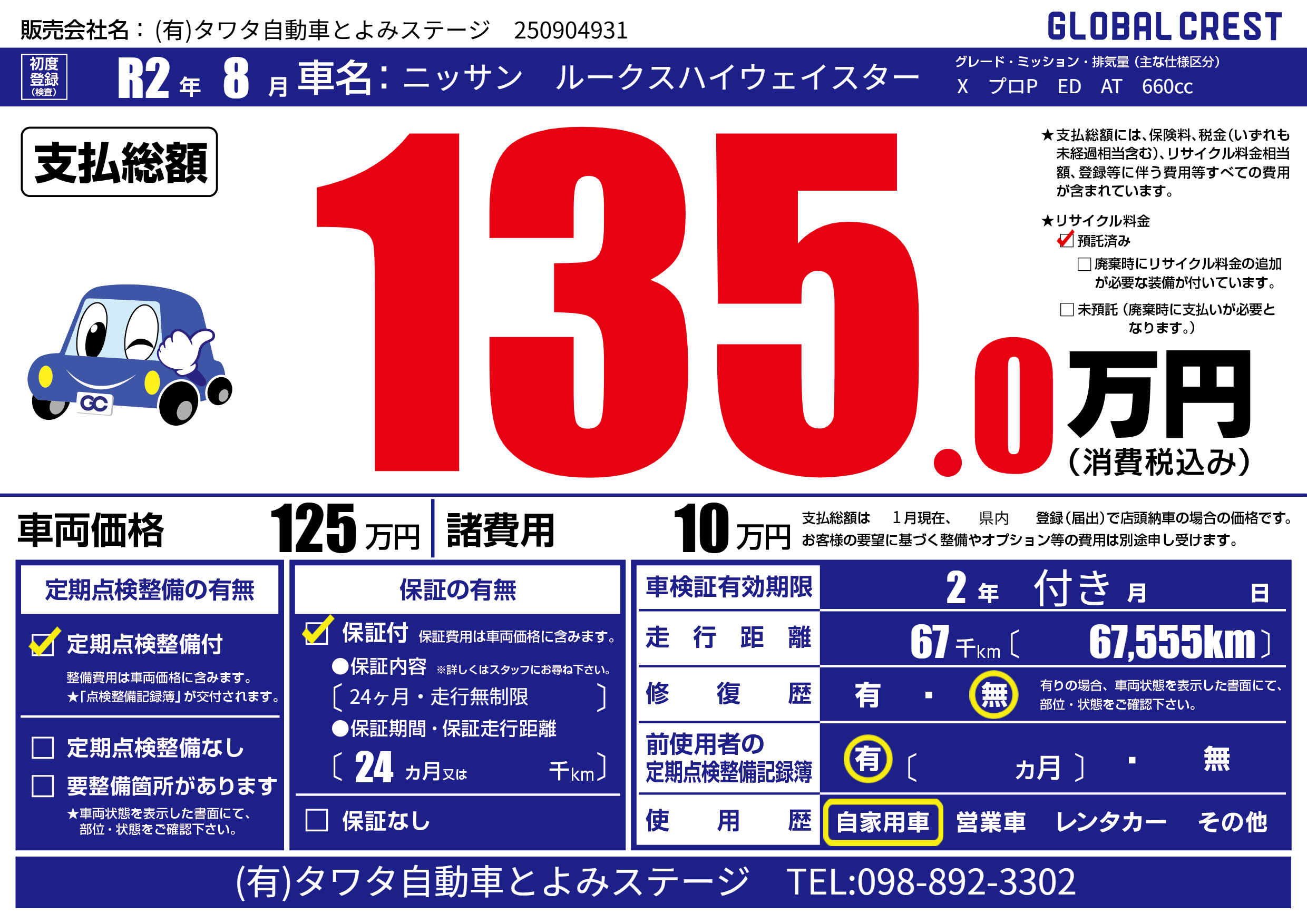 | 走行キロ | 6.7万km | 初年度登録 | R2年8月 |