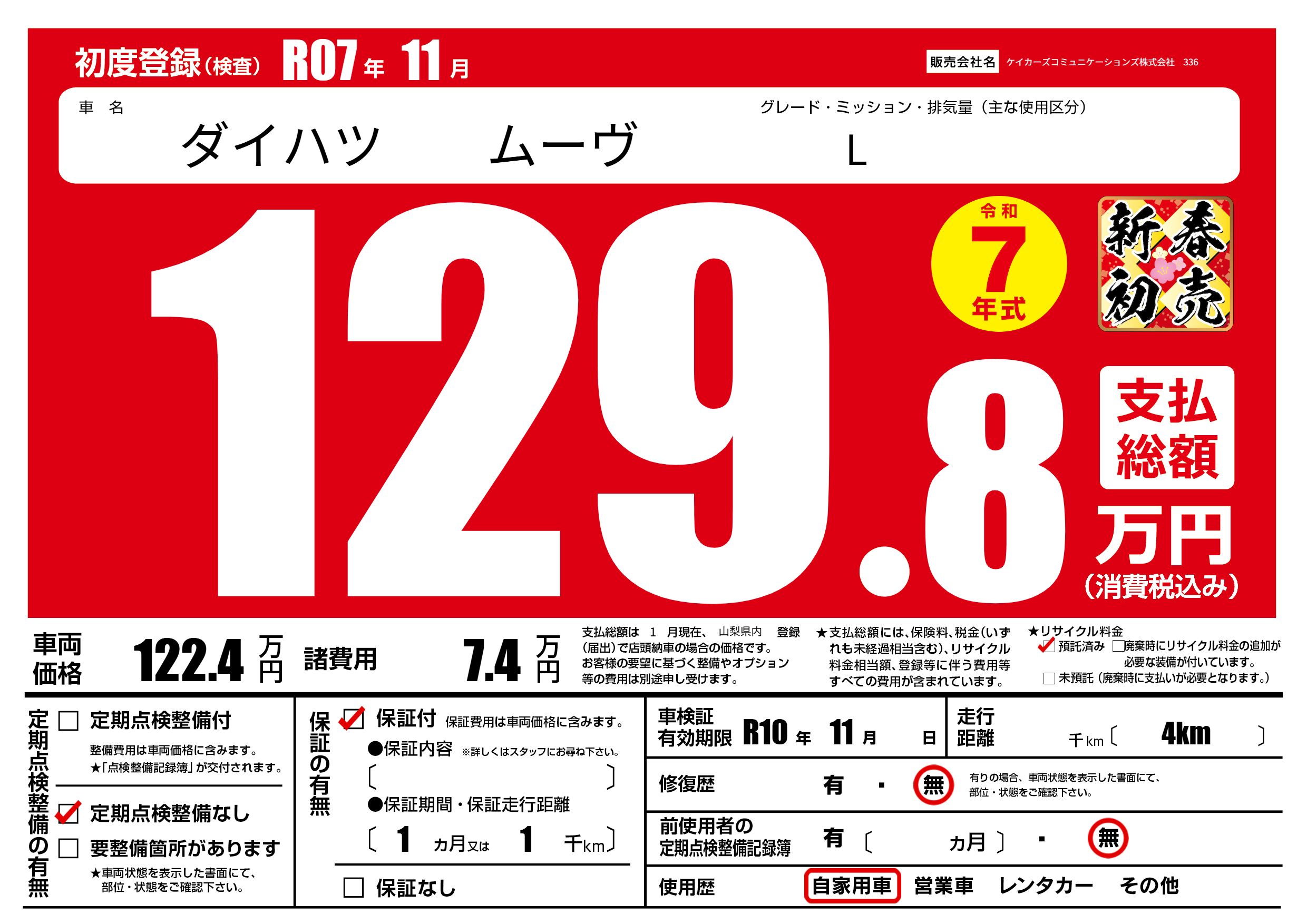 | 車検制限 | R10年 11月 - 日 | ||