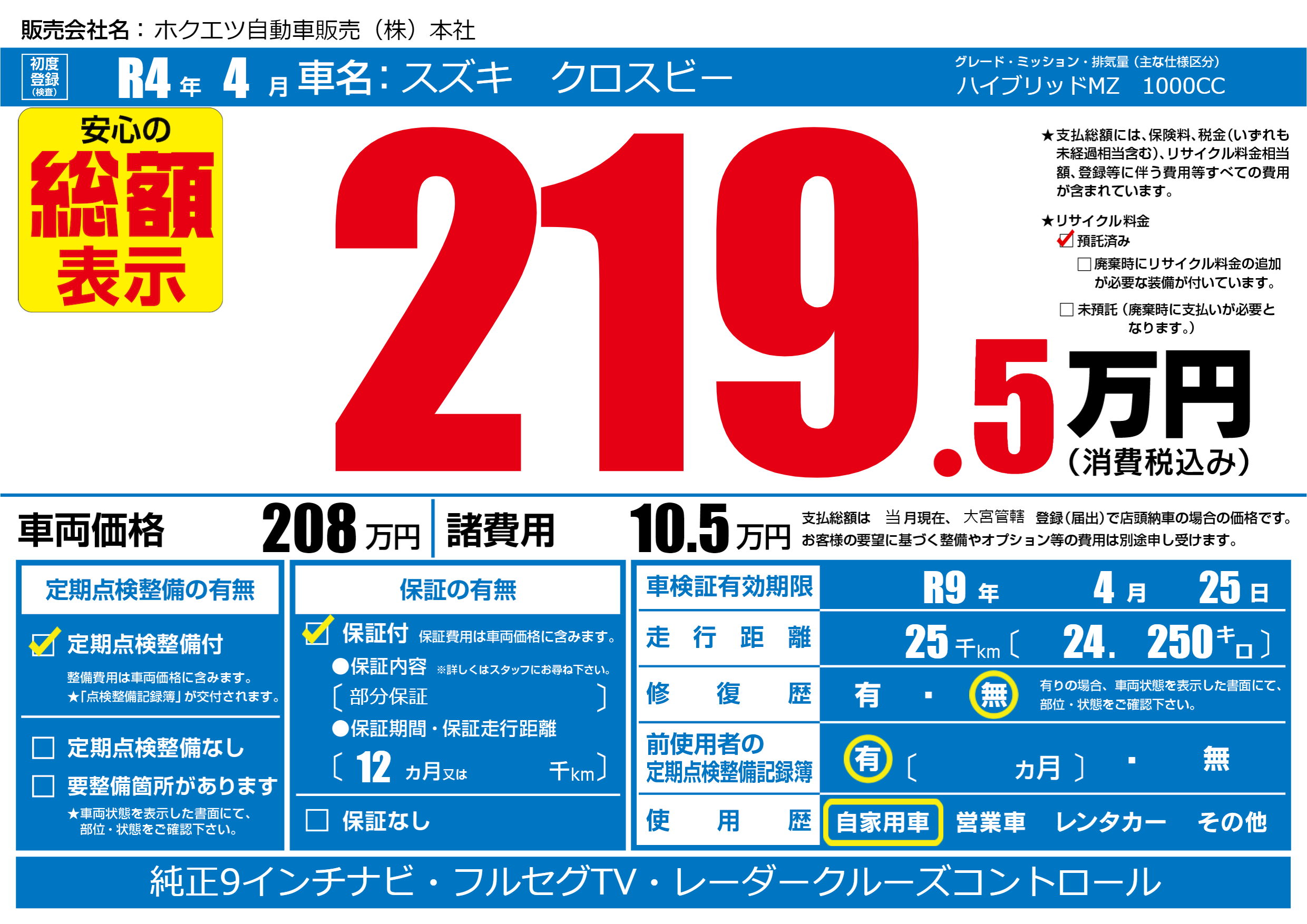 なし | 車検制限 | R9年4月25月 |