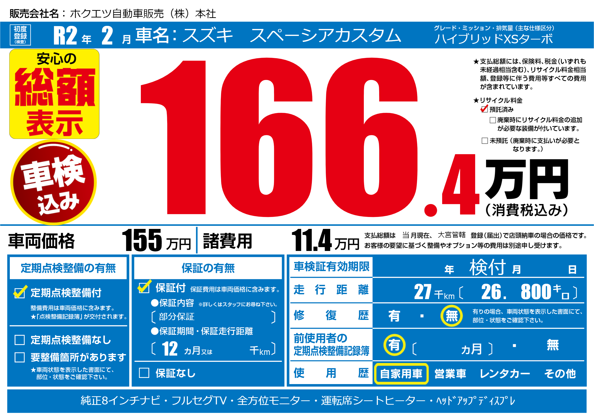 | 走行キロ | 2.7万km | 初年度登録 | R2年2月 |
