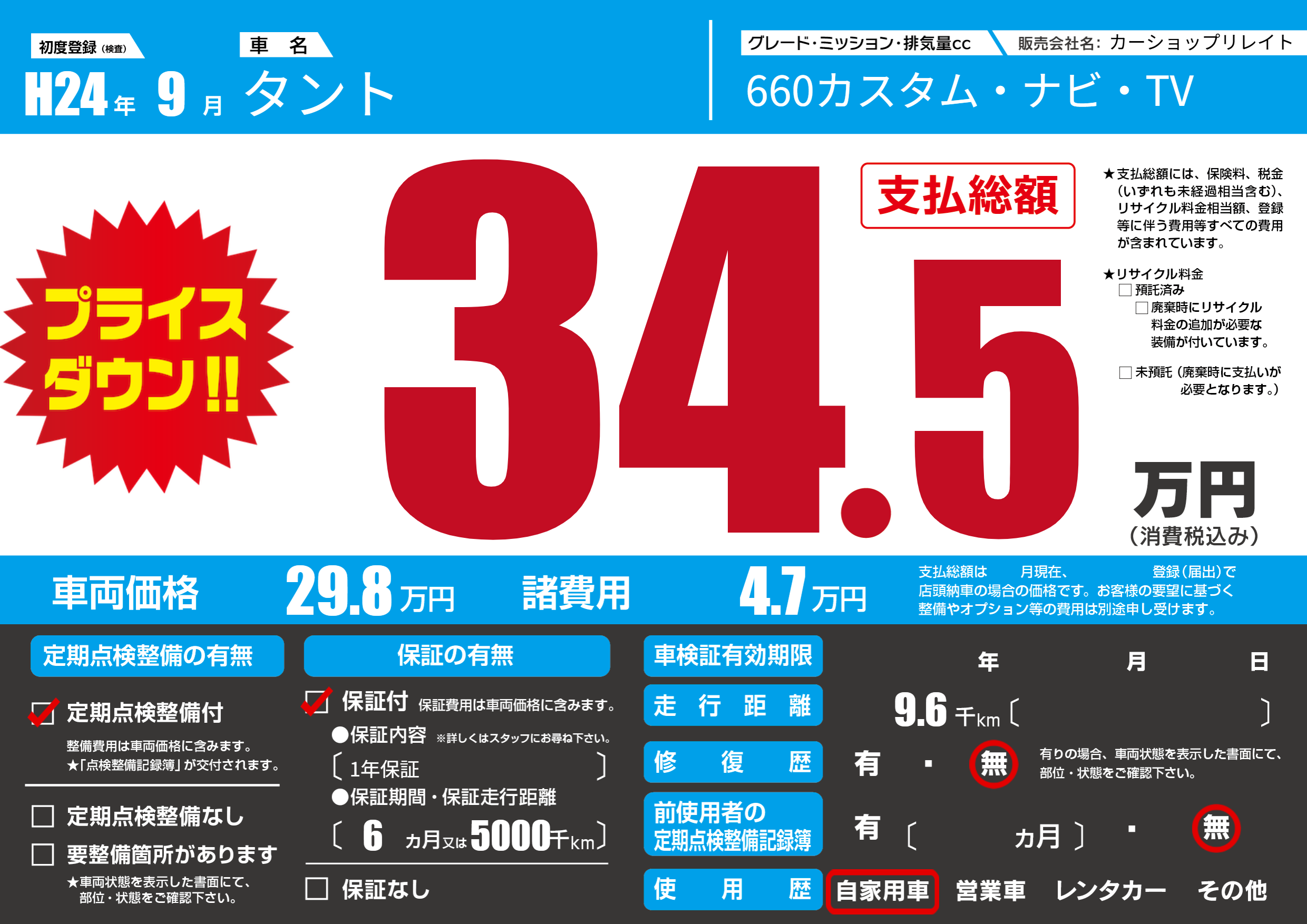 | 走行キロ | 0.9万km | 初年度登録 | H24年9月 |