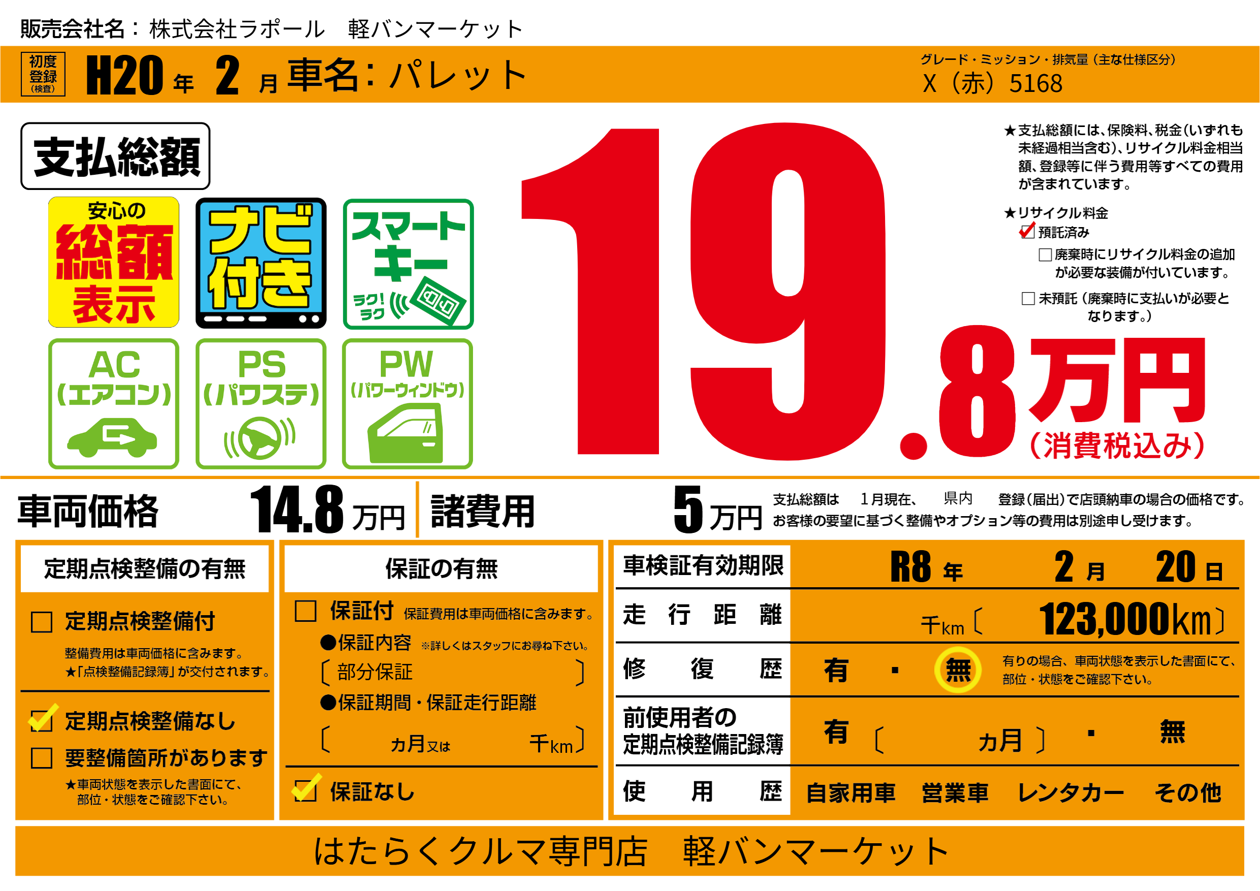 なし | 車検制限 | R8年2月20月 |