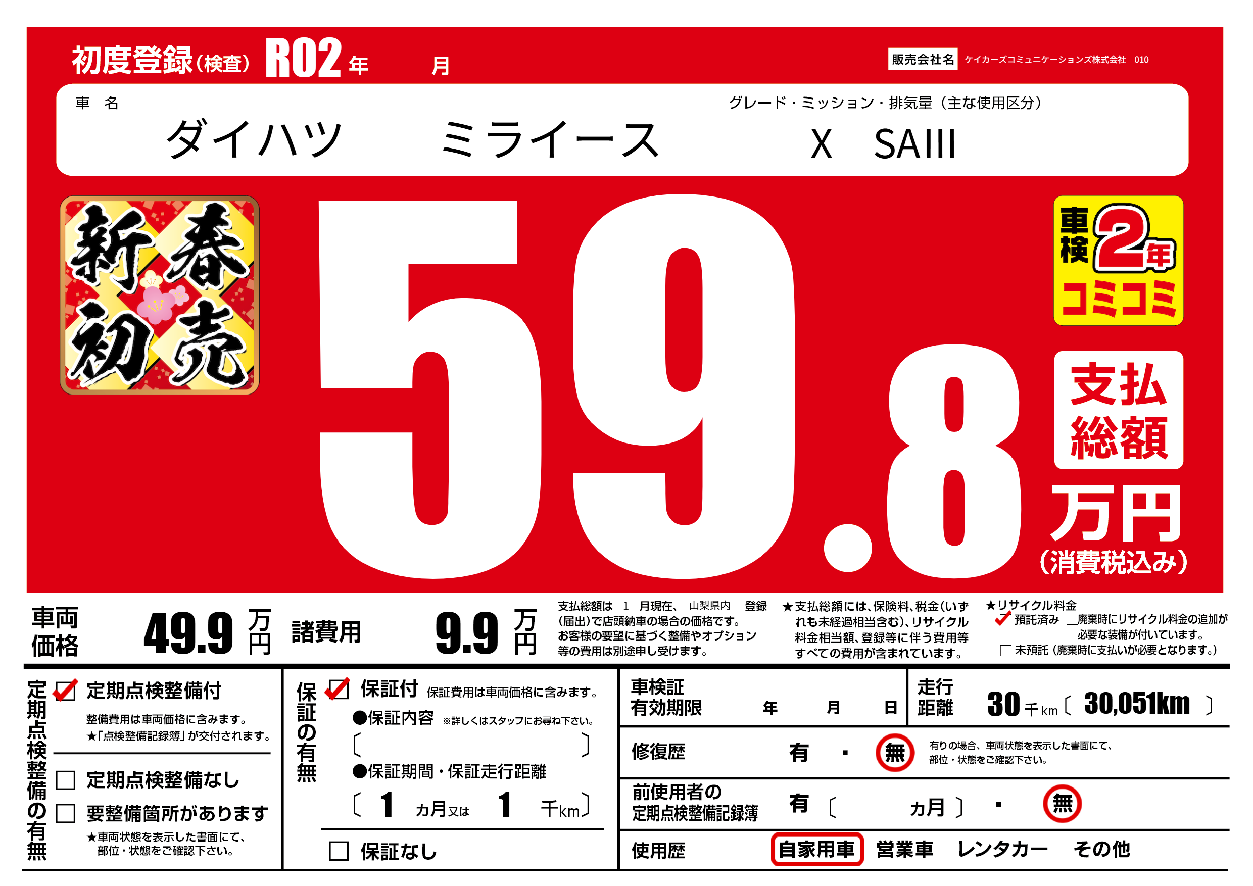 | 走行キロ | 3万km | 初年度登録 | R02年---月 |