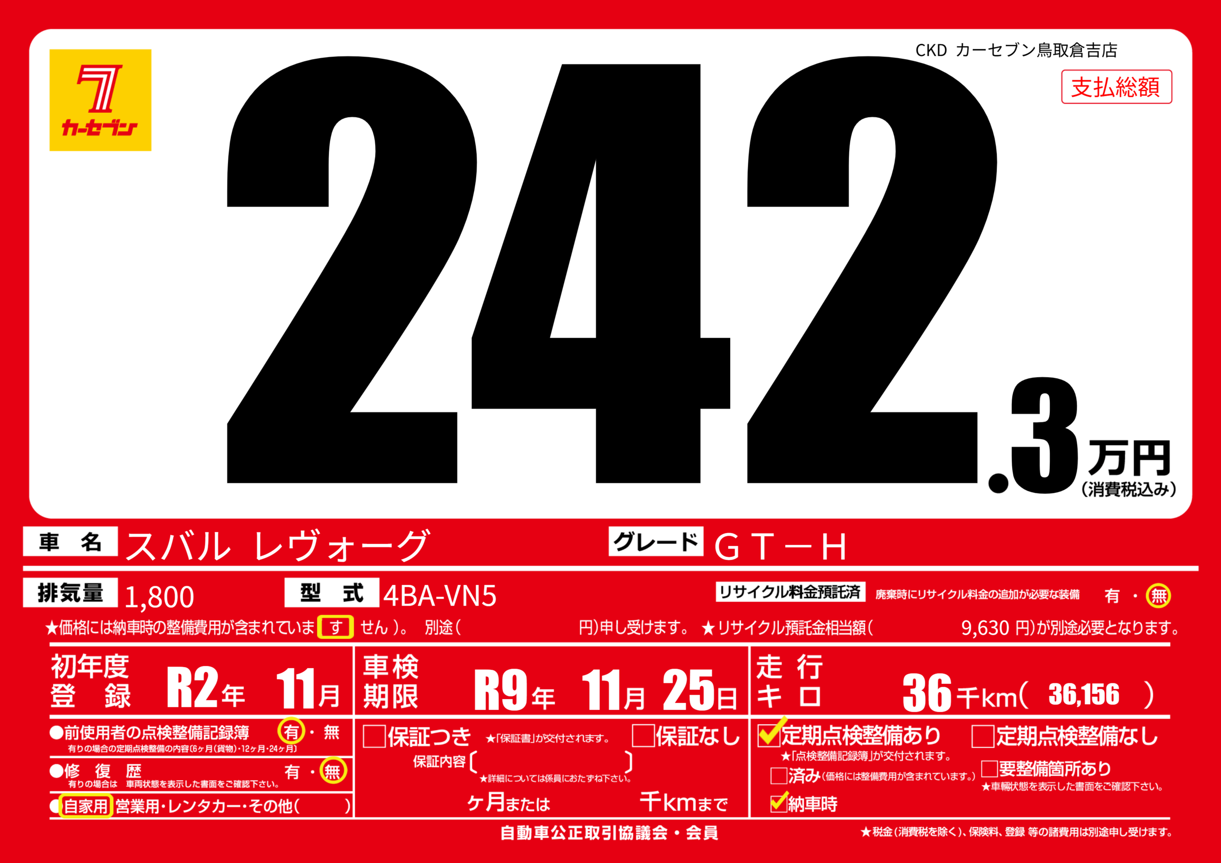 | 車名 | スバル レヴォーグ | グレード ミッション 排気量 |
