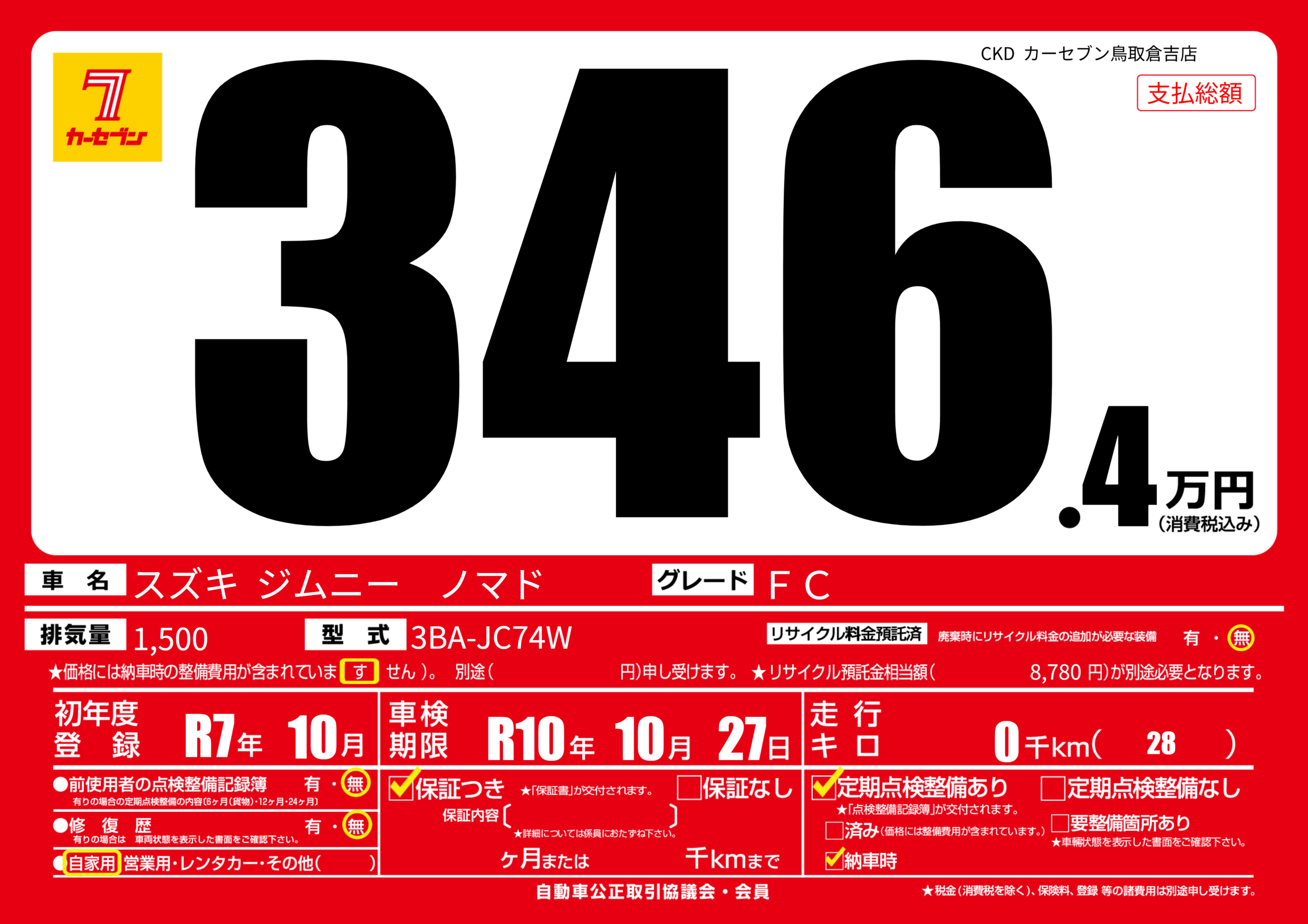 | 走行キロ | - | 初年度登録 | R7年10月 |