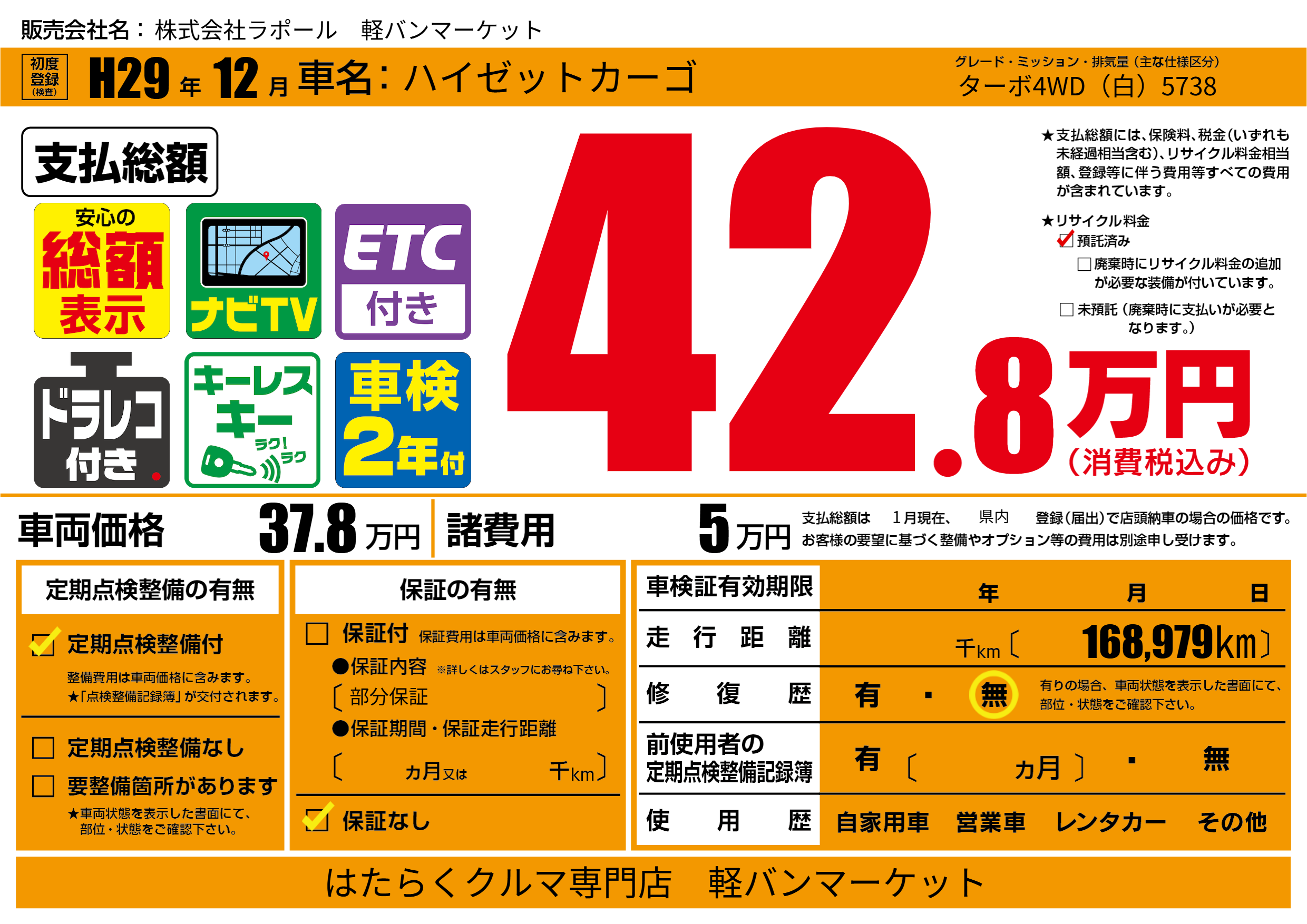 | 車名 | ハイゼットカーゴ | グレード ミッション 排気量 |