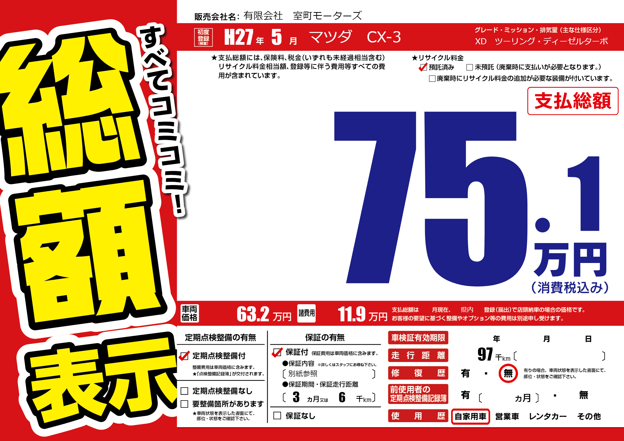 保証付き 保証内容(別紙参照) 3ヶ月または(6)千kmまで |
